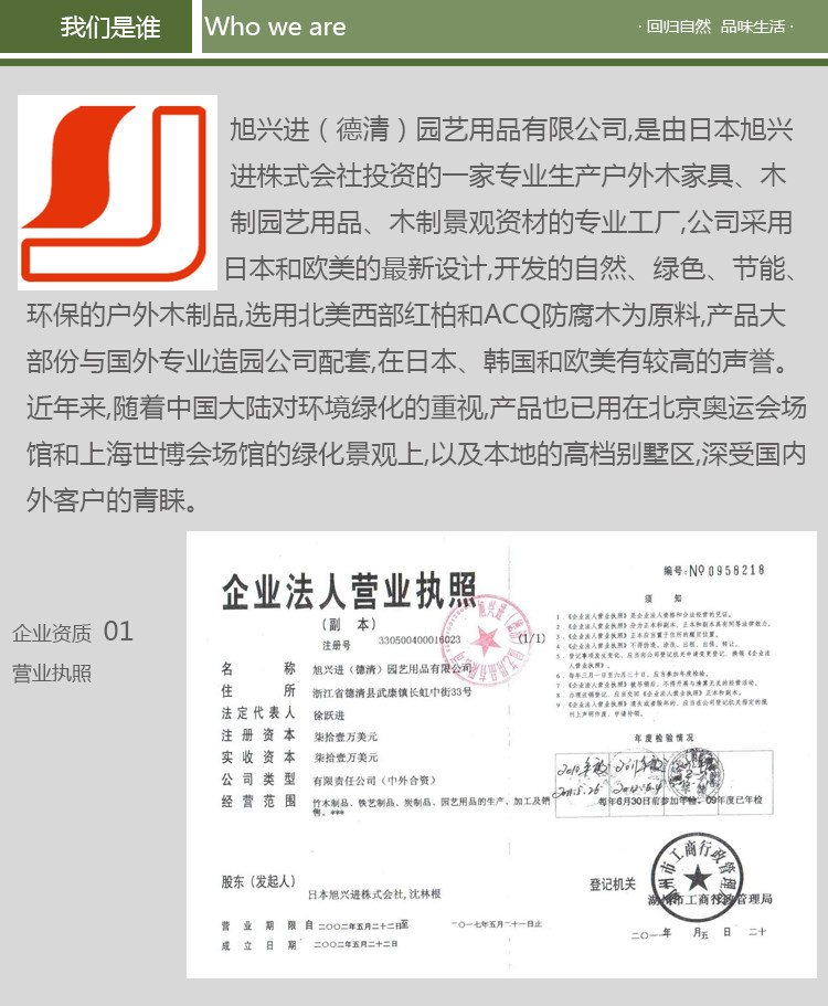Наша компания есть“Сюйси Синдзин (DeQing) Horticulutural Products Co., Ltd.”Это профессиональная фабрика, специализирующаяся на производстве деревянной мебели, деревянных садовых продуктов и деревянных ландшафтных материалов, инвестированных японским заводом XUXING. Цель компании состоит в том, что качественное превосходство, сначала клиент.Я искренне приветствую руководство новых и старых клиентов.