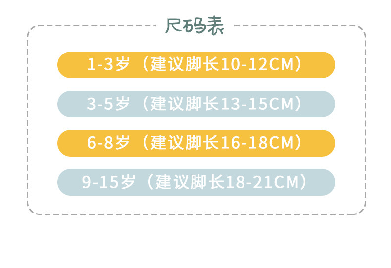 | Возрастная категория: | 1-3 года (рекомендуется код обуви 22-25 ярдов), 3-5 лет (рекомендуется код обуви 25-28 ярдов), 6-8 лет (предлагая код обуви 28-33 ярдов), 9-15 лет (предлагая код обуви 33-38 ярдов) |