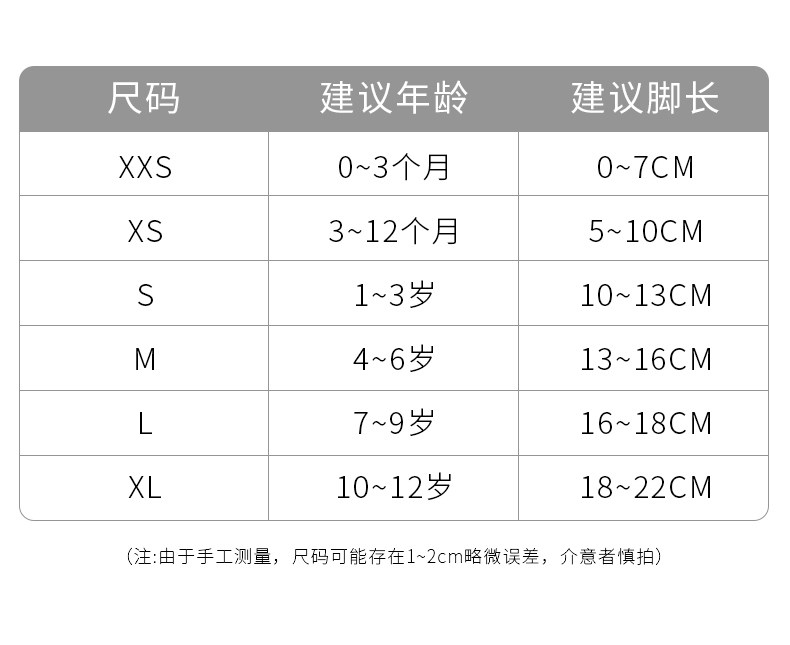 - XXS (рекомендуемая длина стопы 0–7 см для детей 0–3 месяцев)