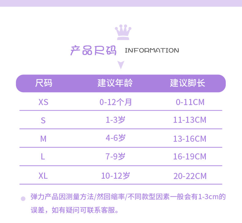 | Возрастная категория: | Xs (предполагая длину ноги 0-11 см в 0-11 см) (необязательно новорожденного), S код (1-3 года рекомендуется в длину 11-13 см) (качество младенцев), M-код (4-6 лет рекомендуется иметь длину 13-16 см) (удобно для кожи и дышащие), L Код (6-9 лет Рекомендуемые ноги 16-19 см) (без флуоресцентного агента), XL-код (длиной 10-22 см) (10-22 см) (высокие бомбы и ноги Нова) |
