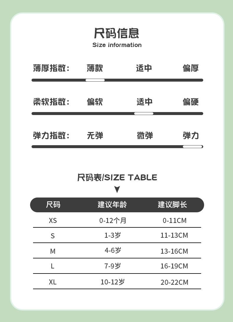 | Возрастная категория: | S код (1-3 года рекомендуется в длину 11-13 см) (качество младенцев), M-код (4-6 лет рекомендуется иметь длину 13-16 см) (удобно для кожи и дышащие), L Код (6-9 лет Рекомендуемые ноги 16-19 см) (без флуоресцентного агента), XL-код (длиной 10-22 см) (10-22 см) (высокие бомбы и ноги Нова) |