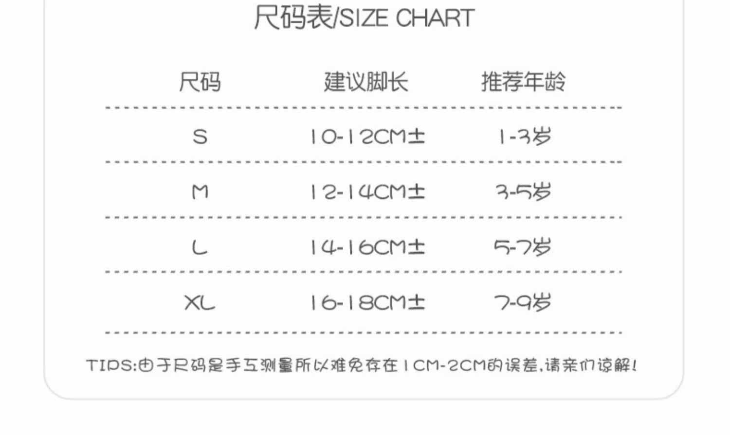 | Возрастная категория: | S код (1-3 года) рекомендуется составлять 10-12 см в длину, M-код (3-5 лет) рекомендуется составлять 12-14 см в длину, L код (5-7 лет) рекомендуется иметь длину 14-16 см., КОД XL (7-9 лет) рекомендуется иметь длину 16-18 см. |