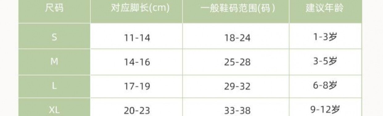 | Возрастная категория: | S код (1-3 года рекомендуется в длину 11-13 см) (качество младенцев), M-код (4-6 лет рекомендуется иметь длину 13-16 см) (удобно для кожи и дышащие), L Код (6-9 лет Рекомендуемые ноги 16-19 см) (без флуоресцентного агента), XL-код (длиной 10-22 см) (10-22 см) (высокие бомбы и ноги Нова) |