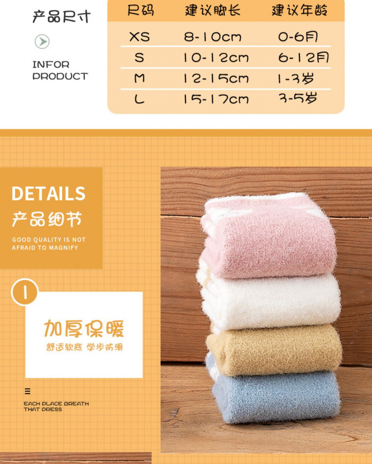 | Возрастная категория: | Размер S [3-12 месяцев, рекомендуемая длина стопы 8-10 см], L код [3-5 лет рекомендуется иметь длину 15-17 см]], Код XS [0–3 месяца, рекомендуемая длина стопы менее 8 см], M код [1-3 года рекомендуется получить длину 10-13 см]] |