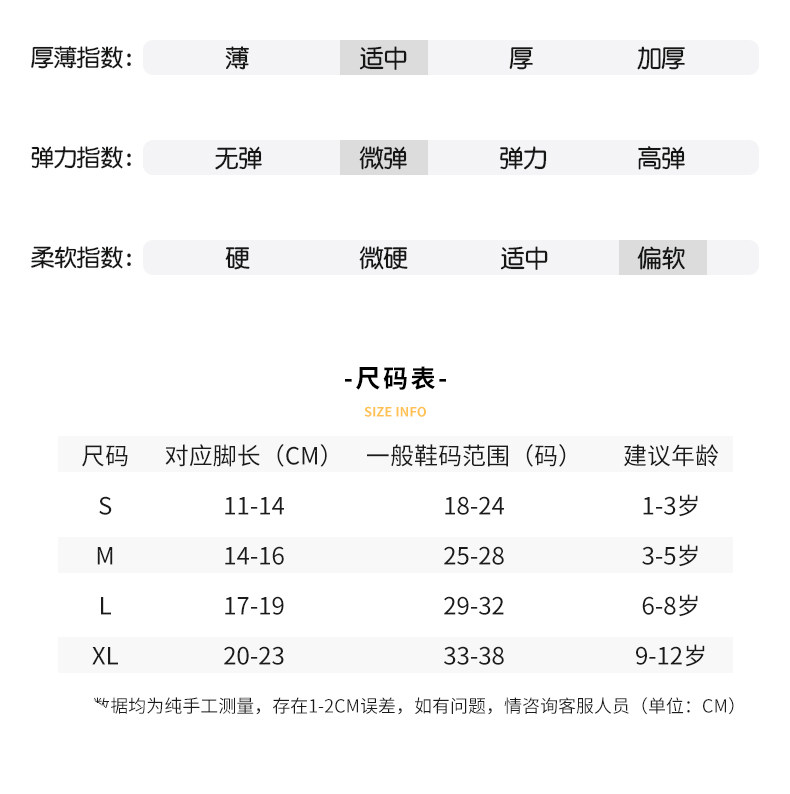 | Возрастная категория: | 1-3 года (длина ноги 10-13 см), 3-5 лет (длина футов 13-16 см), 6-8 лет (длина футов 16-19 см), 9-12 лет (длина футов 19-22 см) |