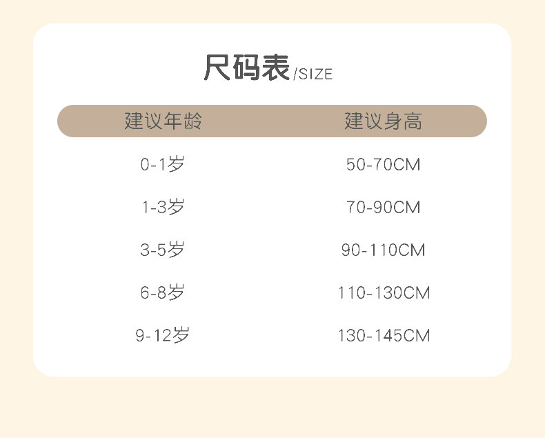 | Возрастная категория: | Рекомендуется быть высотой 50-70 см (подходит для 0-1 лет), Рекомендуется иметь высоту 70-90 см (подходит 1-3 года), Рекомендуется составлять 90-110 см (подходит для 3-5 лет), Рекомендуемый рост 110-130 см (подходит для детей 6-8 лет), Рекомендуется быть высотой 130-145 см (подходит для 9-12 лет) |