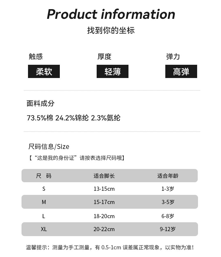 | Возрастная категория: | S (1-3 года в длину 13-15 см), М (3-5 лет длиной 15-17 см), L (6-8 лет длиной 18-20 см), XL (9-12 лет, 20-22 см) |