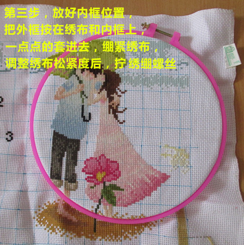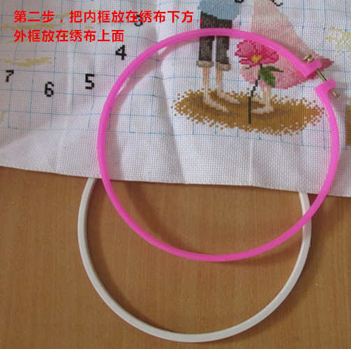 5. Немного нажмите внутреннюю раму и нажмите ткань вышивки в раму (передняя часть внутренней рамки лицом вниз)