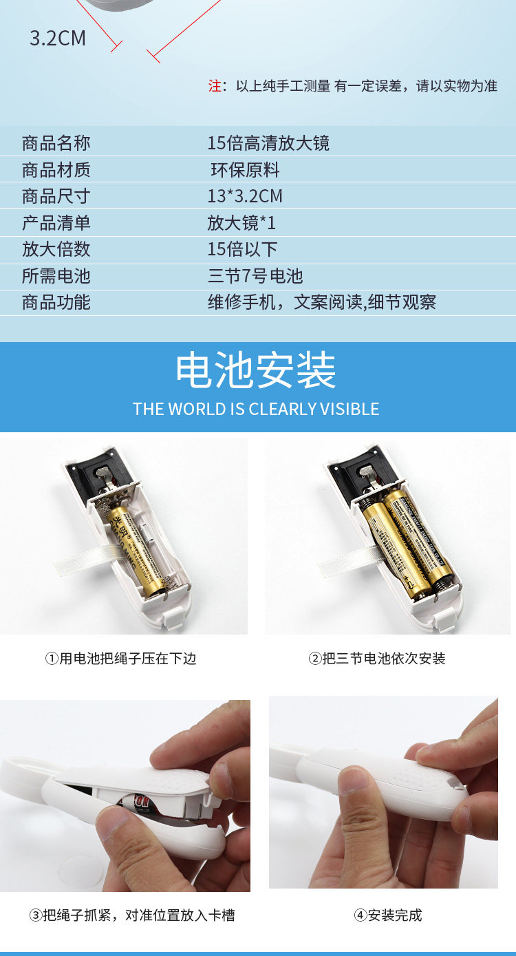 Портативное чтение, лупа с подсветкой, 15x, увеличение в 15 раз, 10 шт