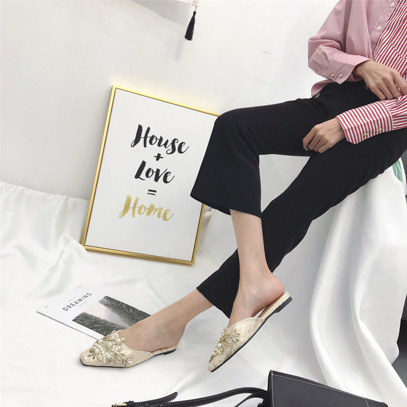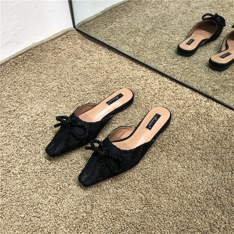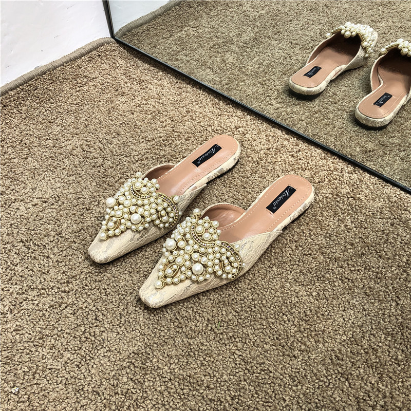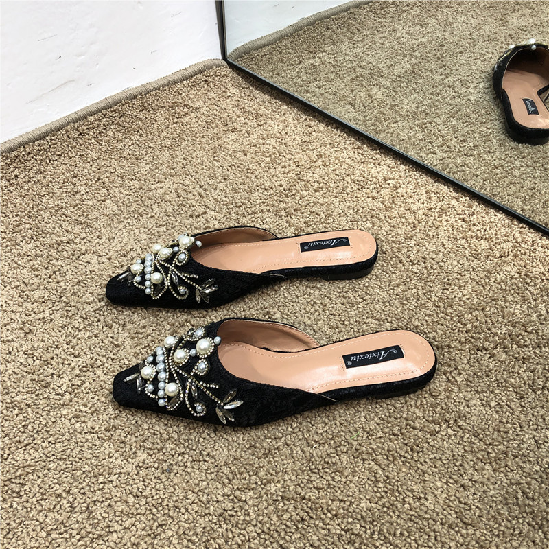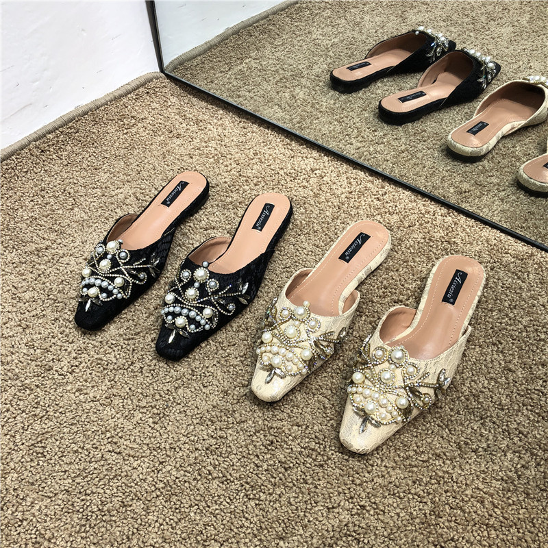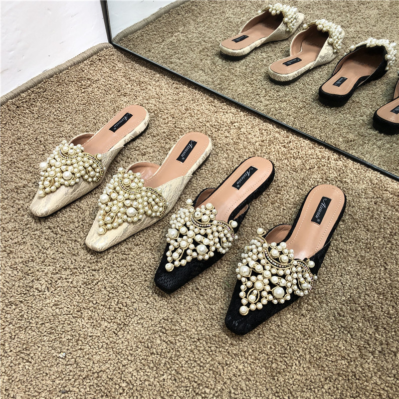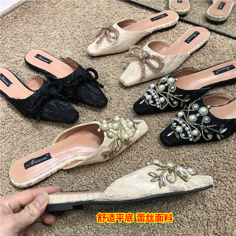 Шикарные корейские кружевные кружевные каблуки с низким содержанием каблуки для женщин для женщин 2025 весны и осенью новых бисеров на внешних мулах