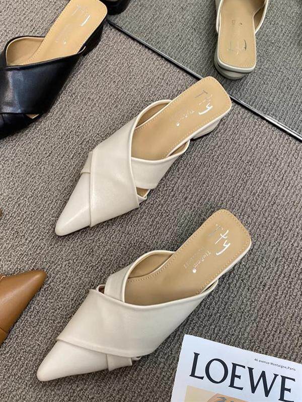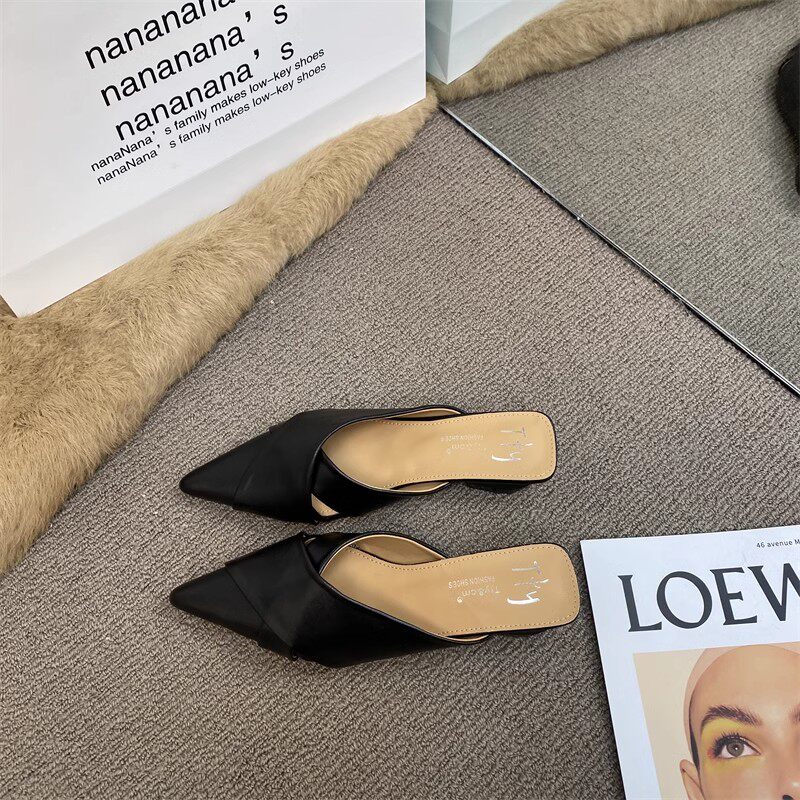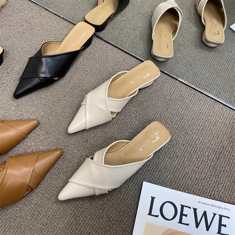 Толстые каблуки, модные заостренные половины тапочки 2025, нет пустых подушек безопасности Lazy Mueller туфли нежные универсальные песчаные тапочки с низким уровнем