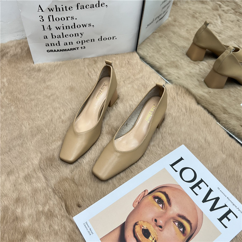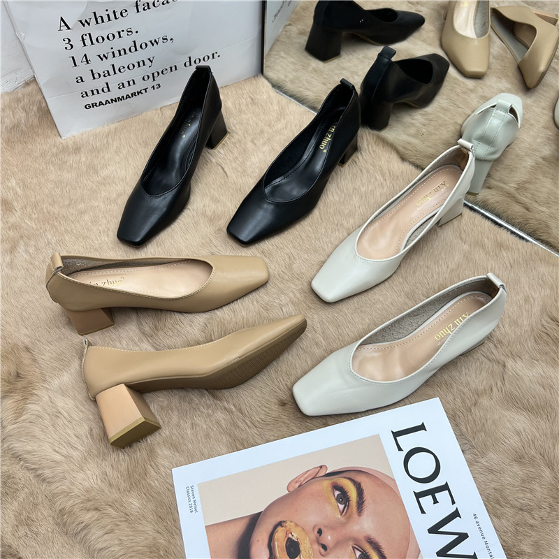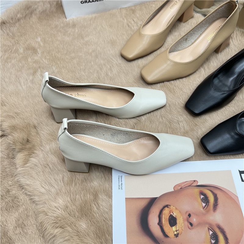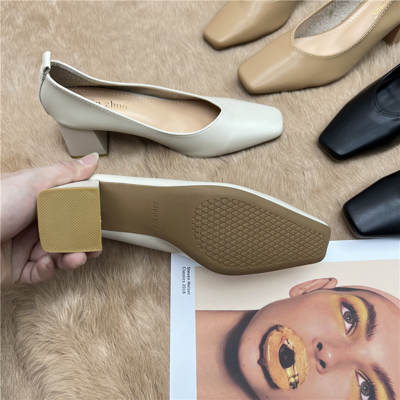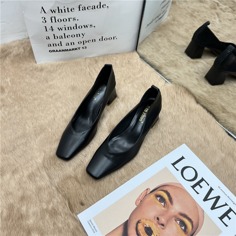 Подлинная кожаная бабушка обувь для женщин Толстые каблуки 2025 Весна Новые квадратные носки высокие каблуки для вечернего бриза нежные рабочие ботинки