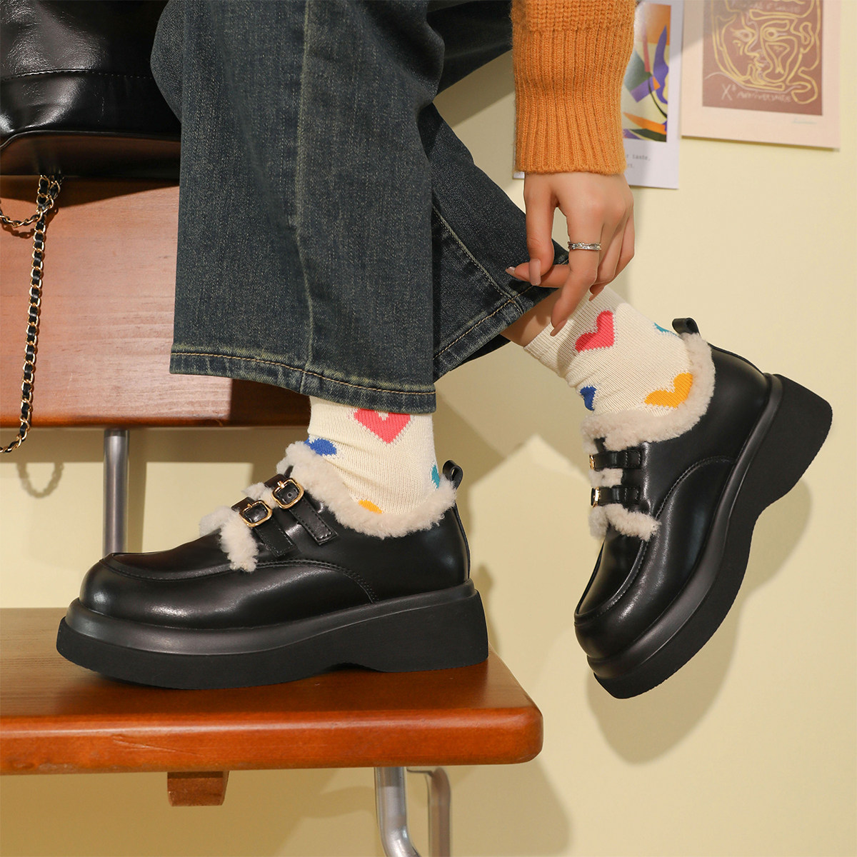 伯爵猫 Демисезонная обувь в английском стиле для кожаной обуви, флисовые высокие лоферы на платформе, из натуральной кожи, в британском стиле