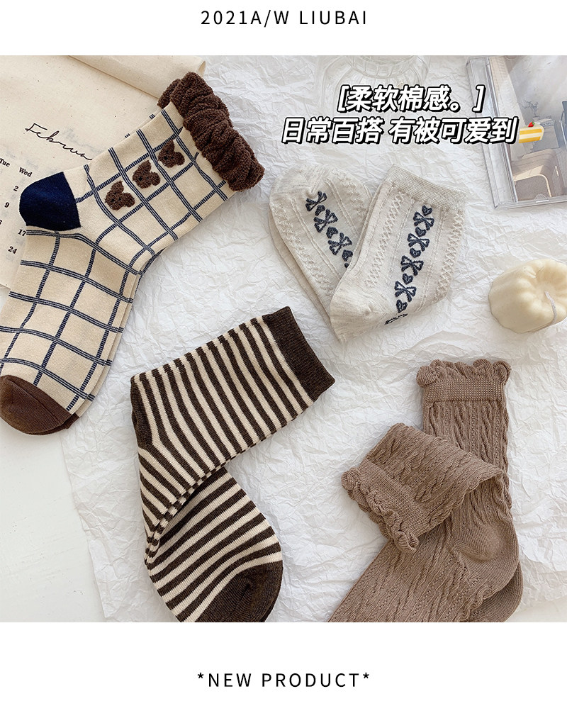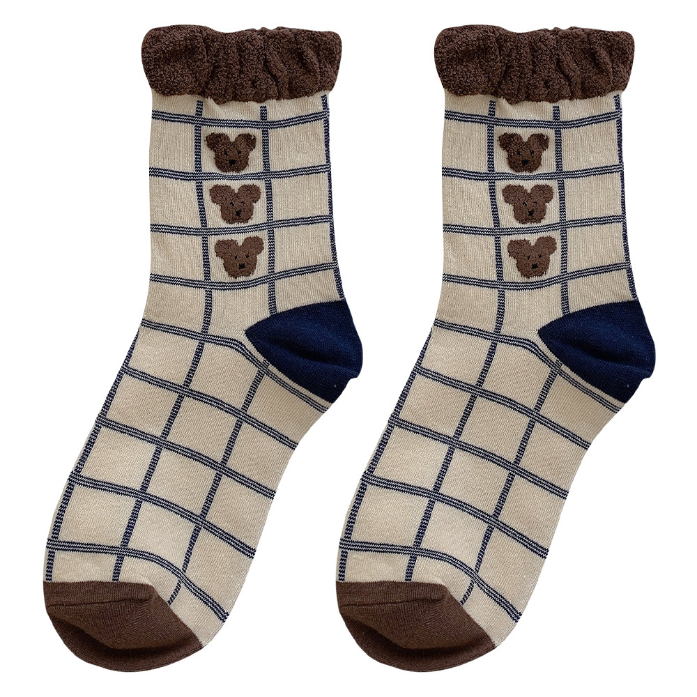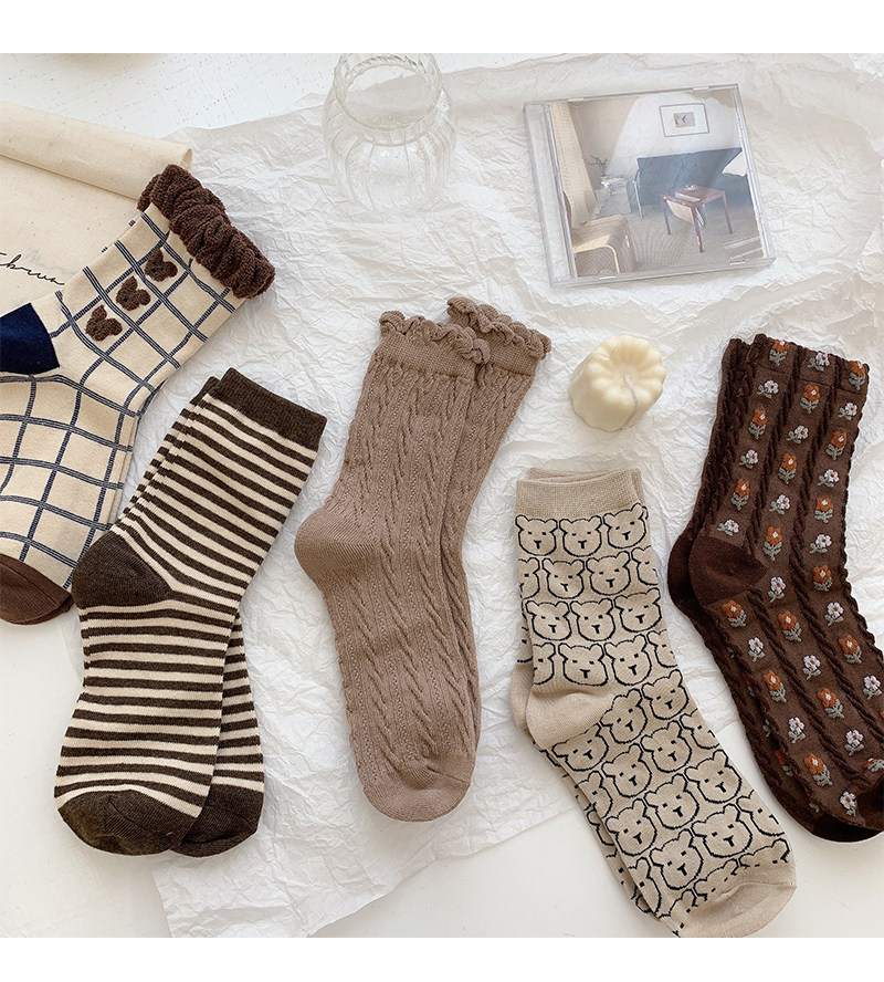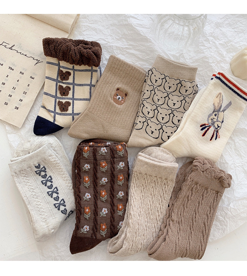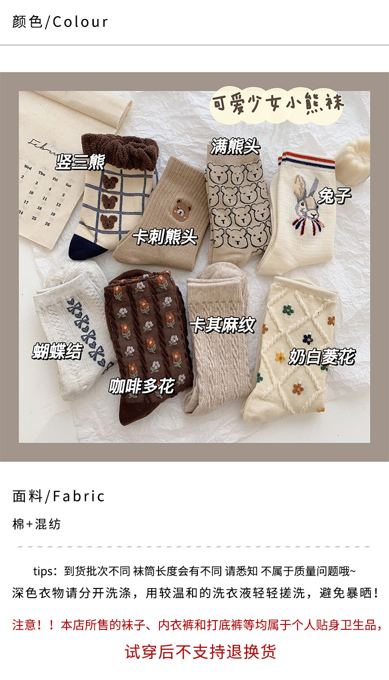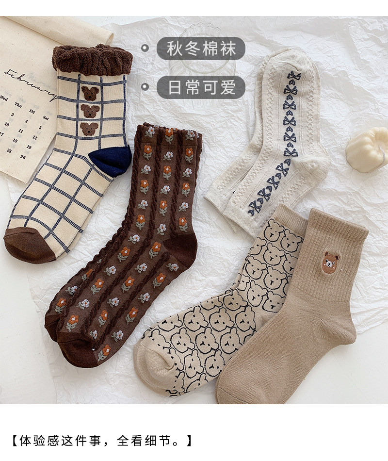 Tide, коричневые демисезонные носки, японские милые белые тонкие осенние гольфы, с медвежатами