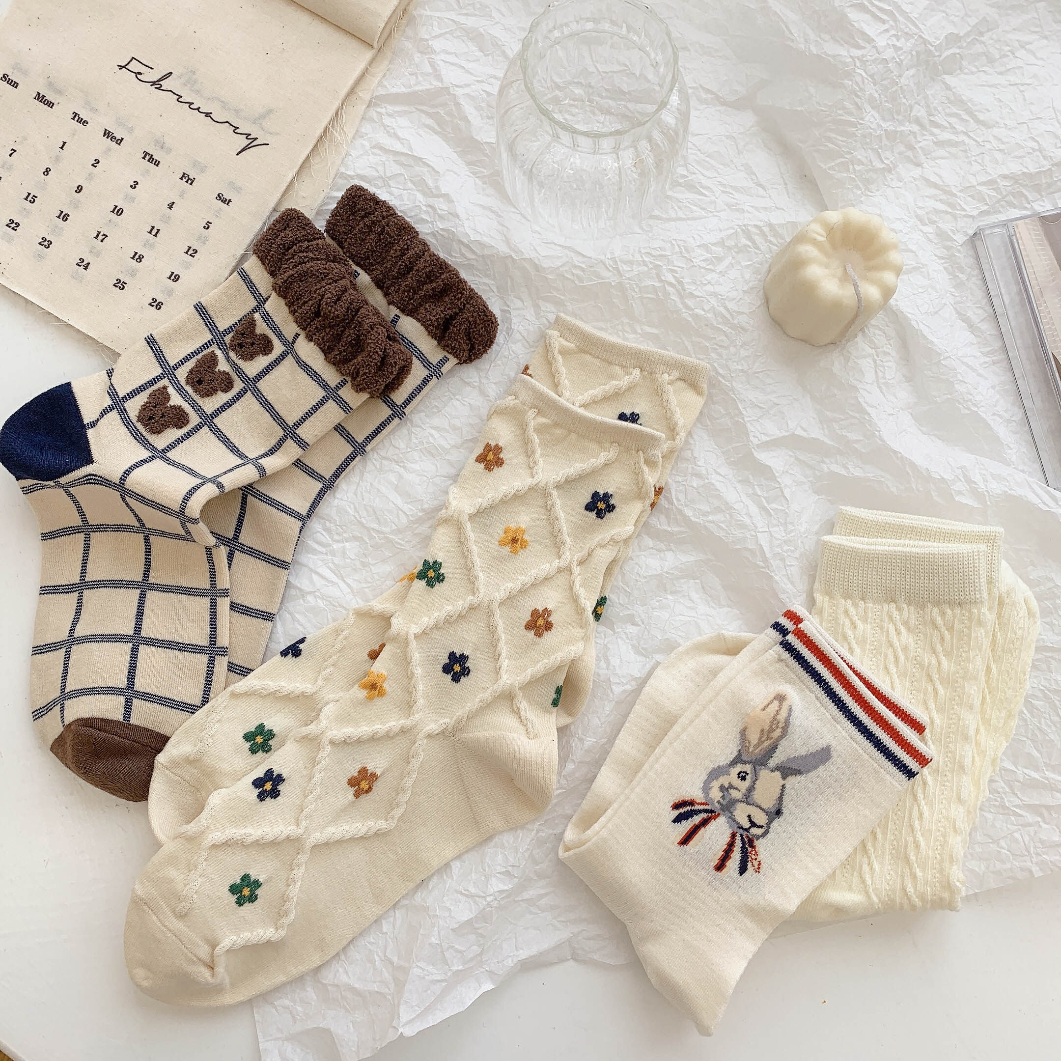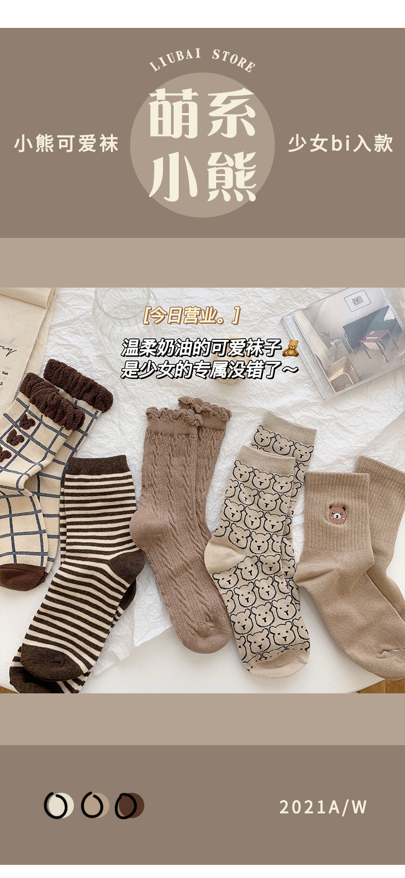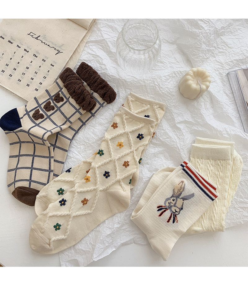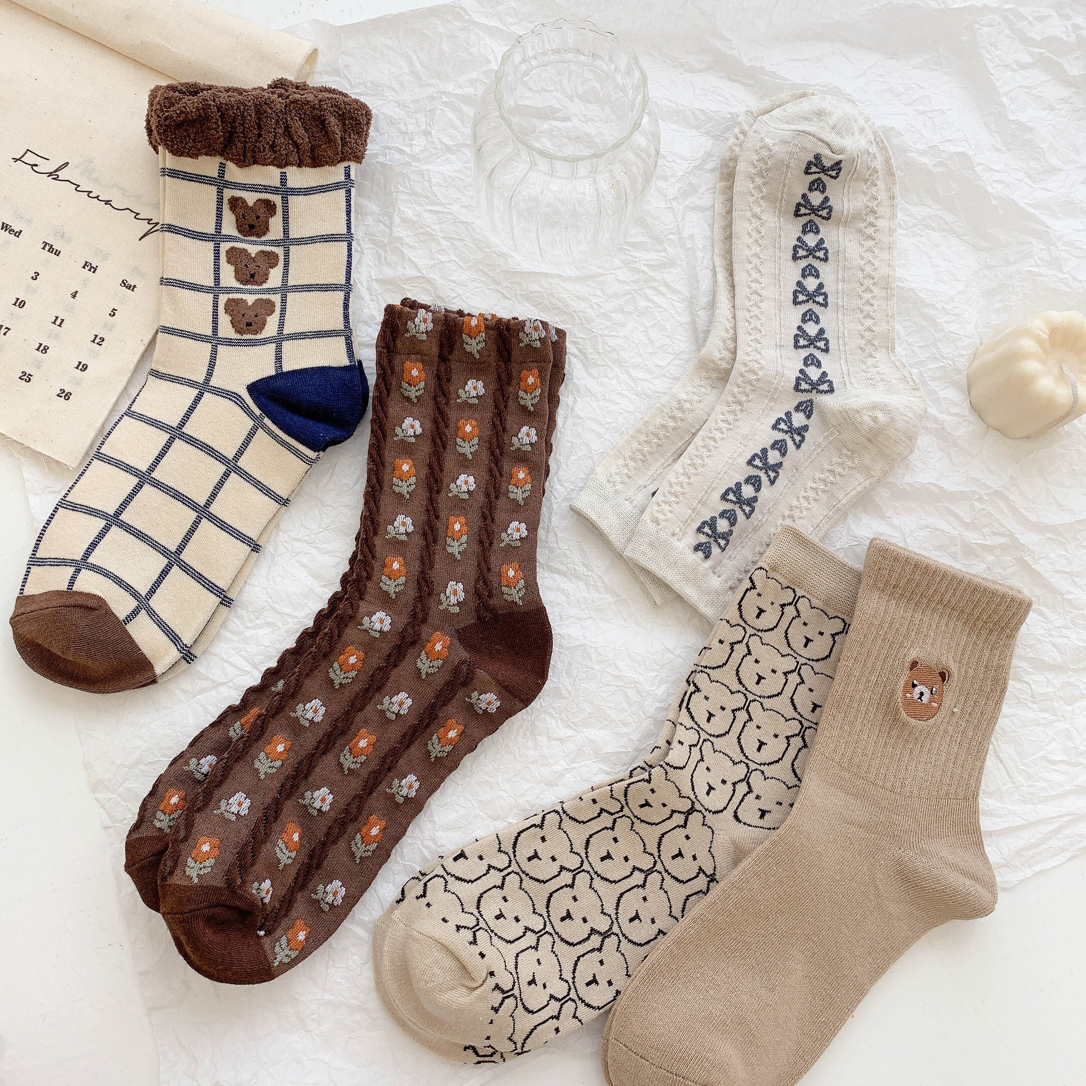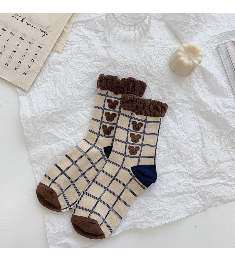 Tide, коричневые демисезонные носки, японские милые белые тонкие осенние гольфы, с медвежатами
