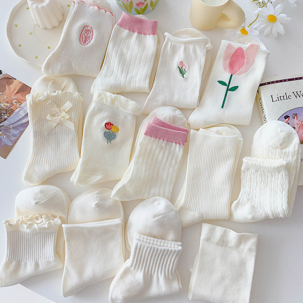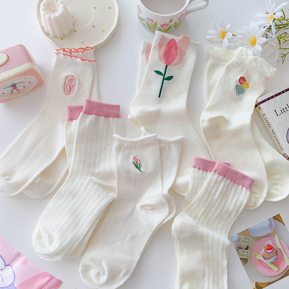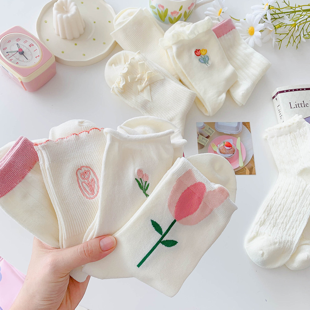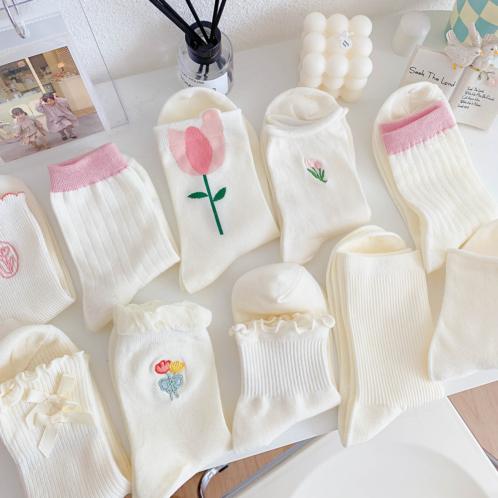 - Xia Nuo Milk-2202 Молочно-белые носки с розовым цветком и рисом