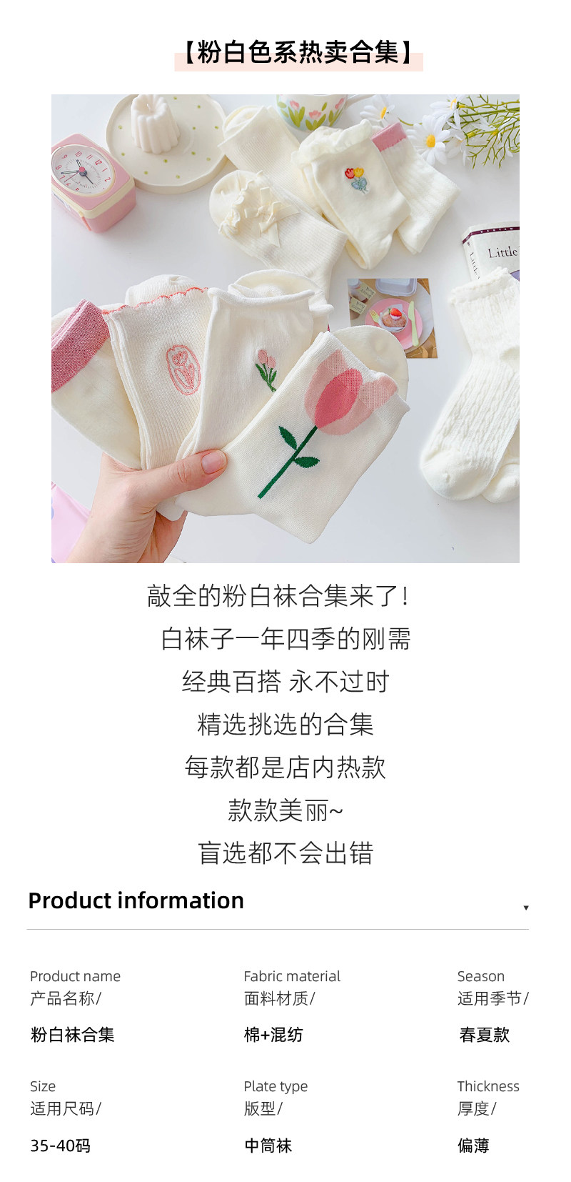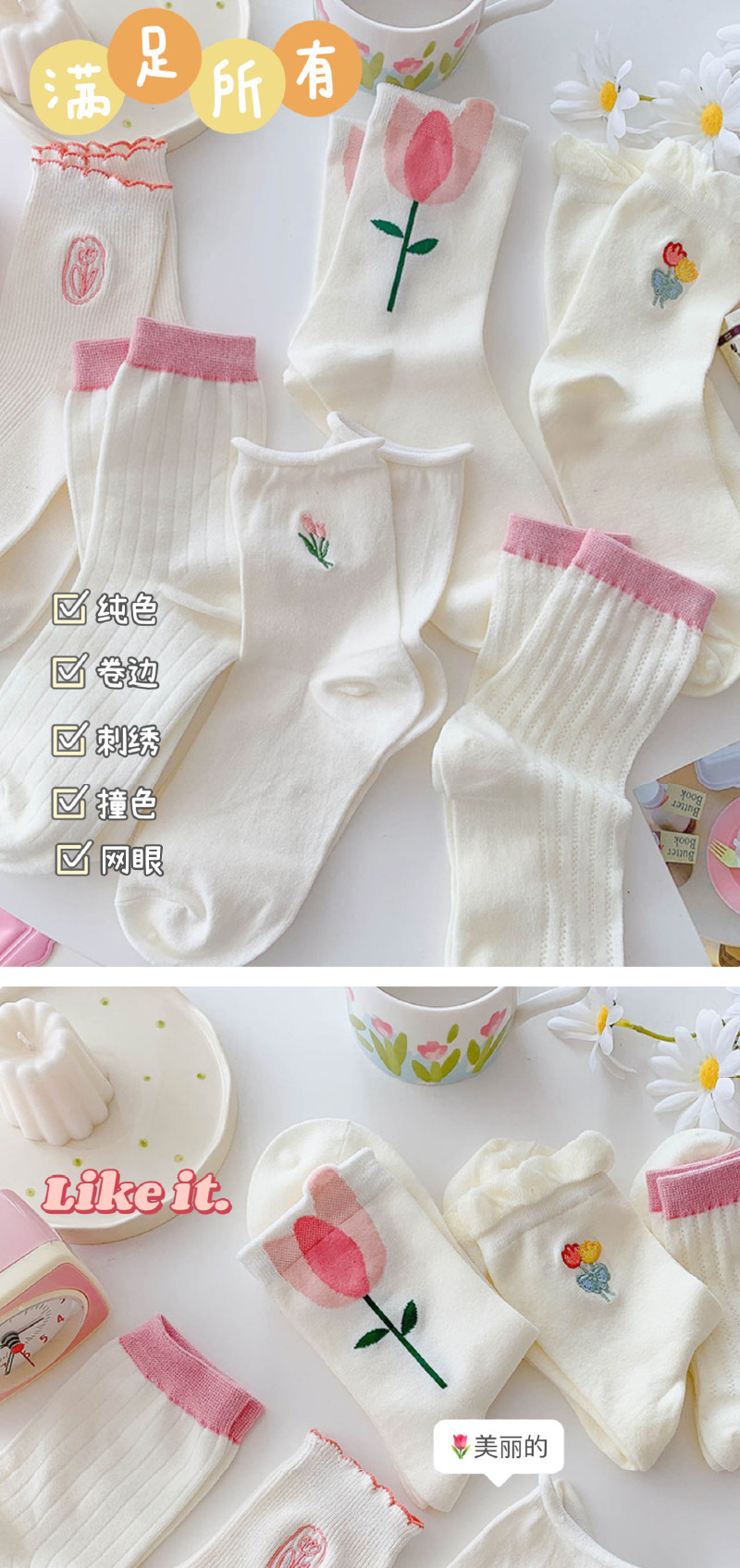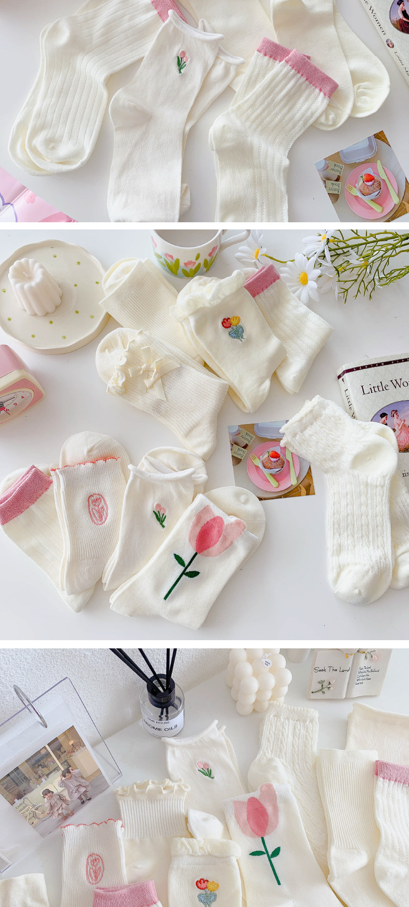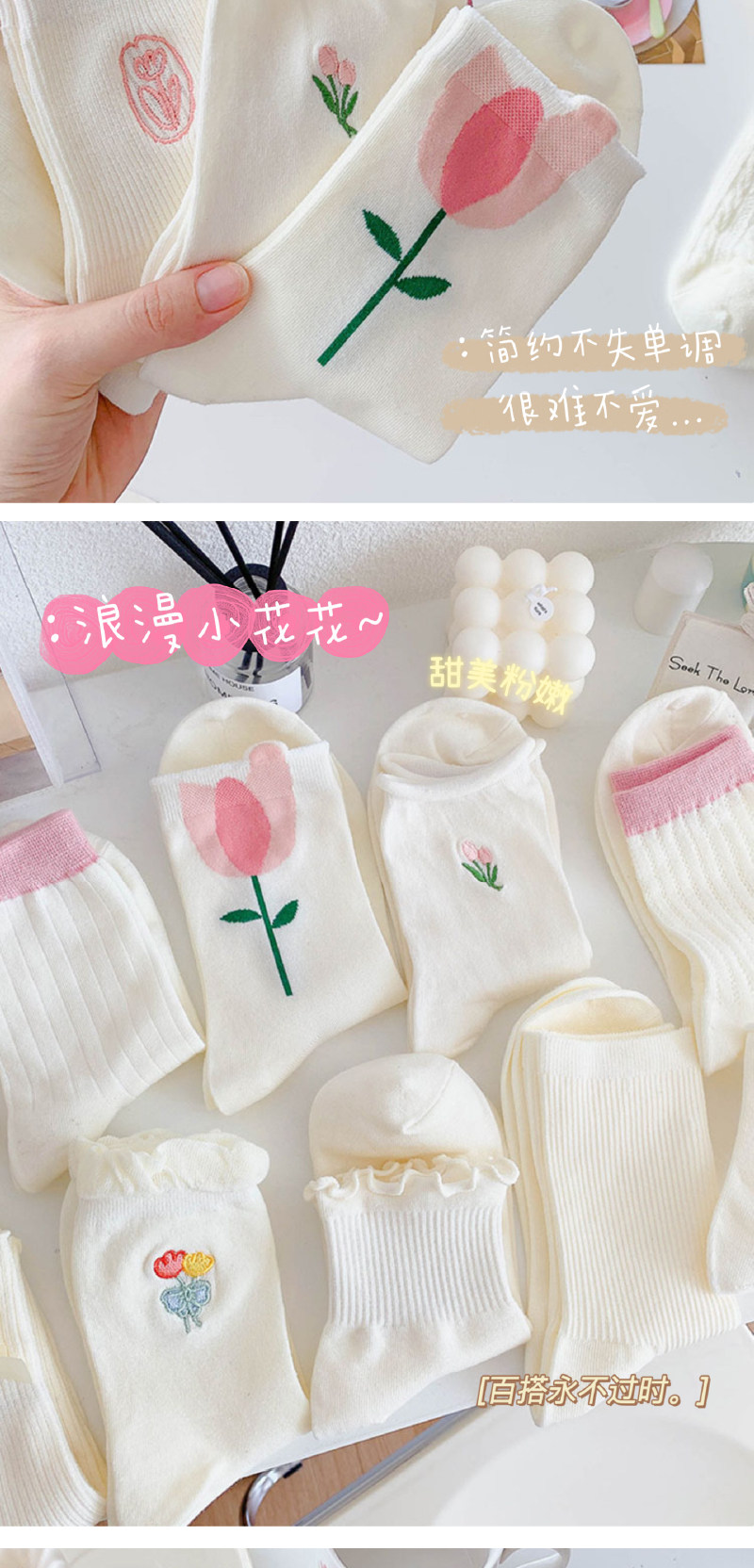 - Xia Nuo Milk-2202 Молочно-белые носки с розовым цветком и рисом