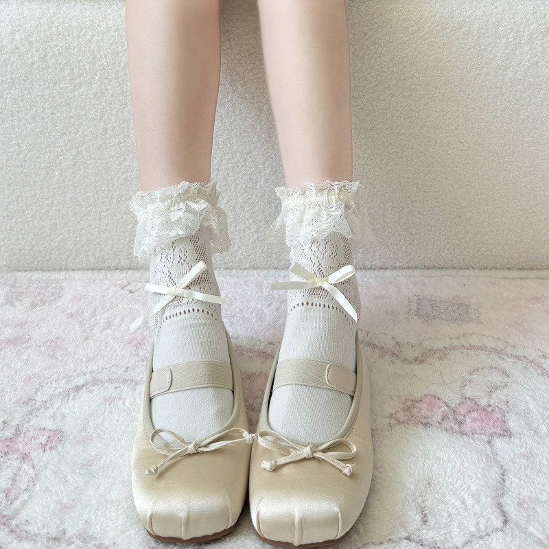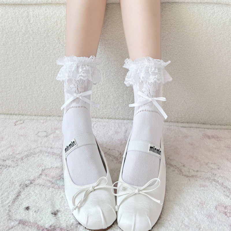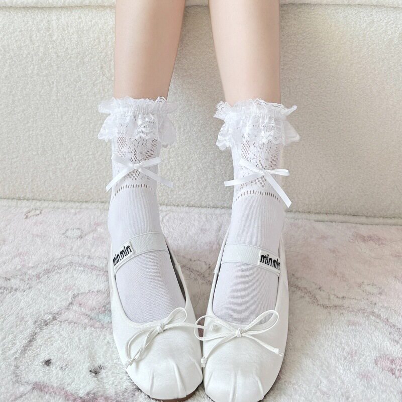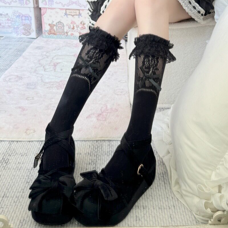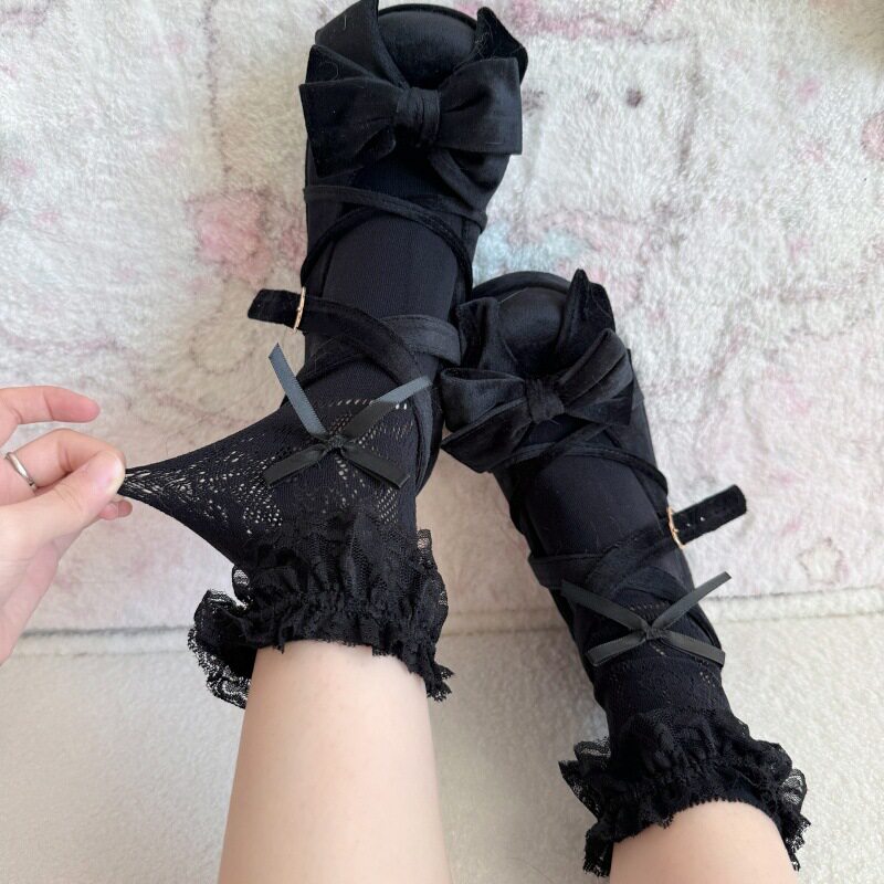 Черные кружевные дышащие тонкие носки с бантиком, кружевное платье, средней длины, подходят для подростков, стиль Лолита