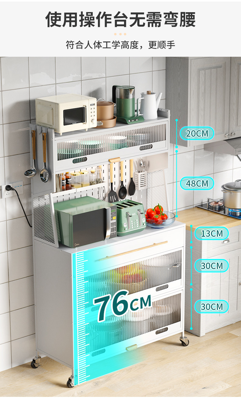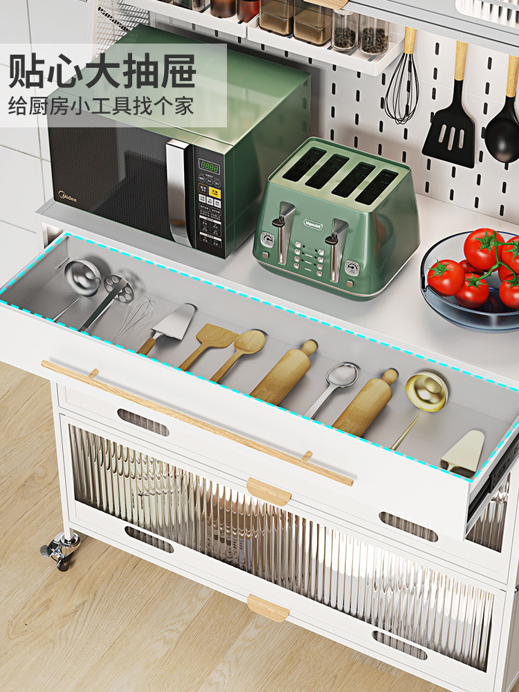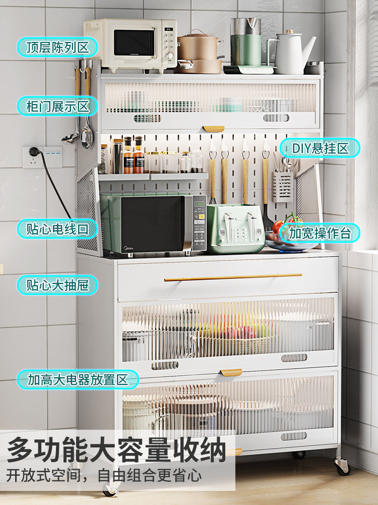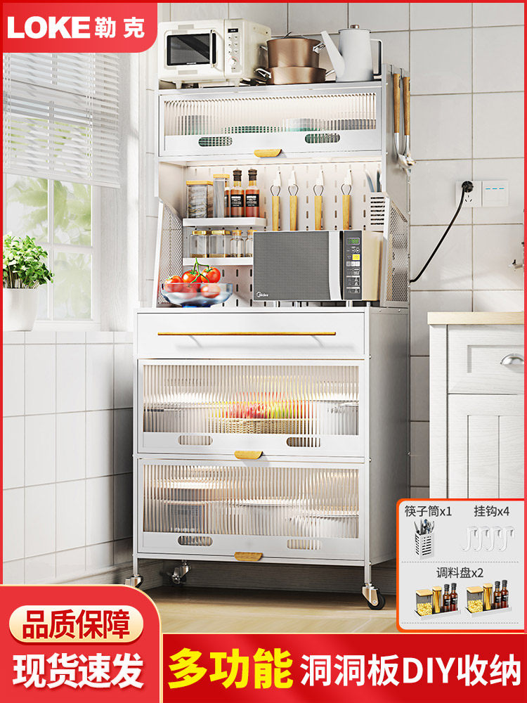 Контейнер для хранения кухонного блюда прислонился к стене и приземленный многослойный шкаф с ящиком многофункциональной стойки для хранения