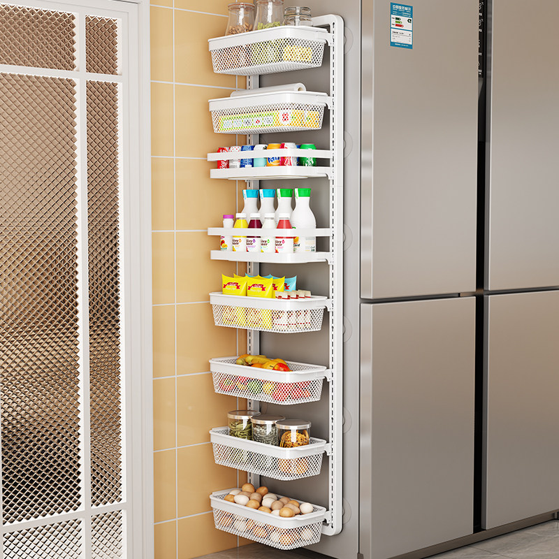 Кухонная полка, холодильник с боковым хранилищем.