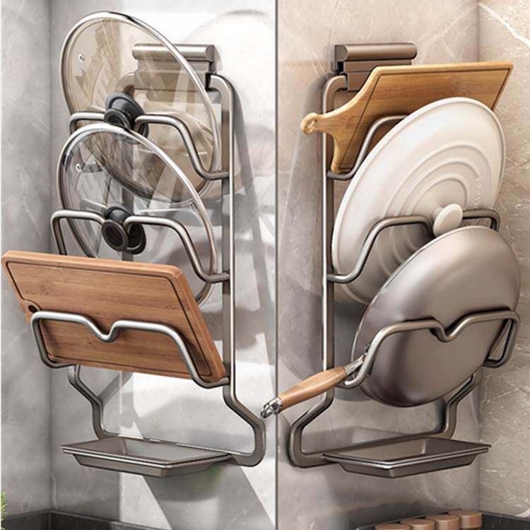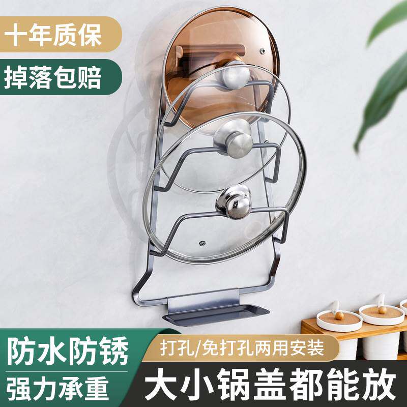 Крышка гнезда, висящая на стене на полке, хранение горшечной крышки крышки, рама свисая на стене, расположенная на кухне.