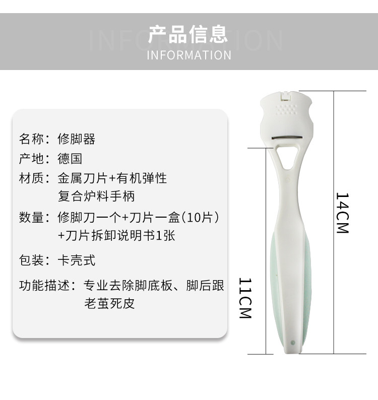 Описание функции: Профессиональное удаление нижней части стопы и пятки мозолей пятки с 10 лезвиями, в общей сложности 11 лезвий.