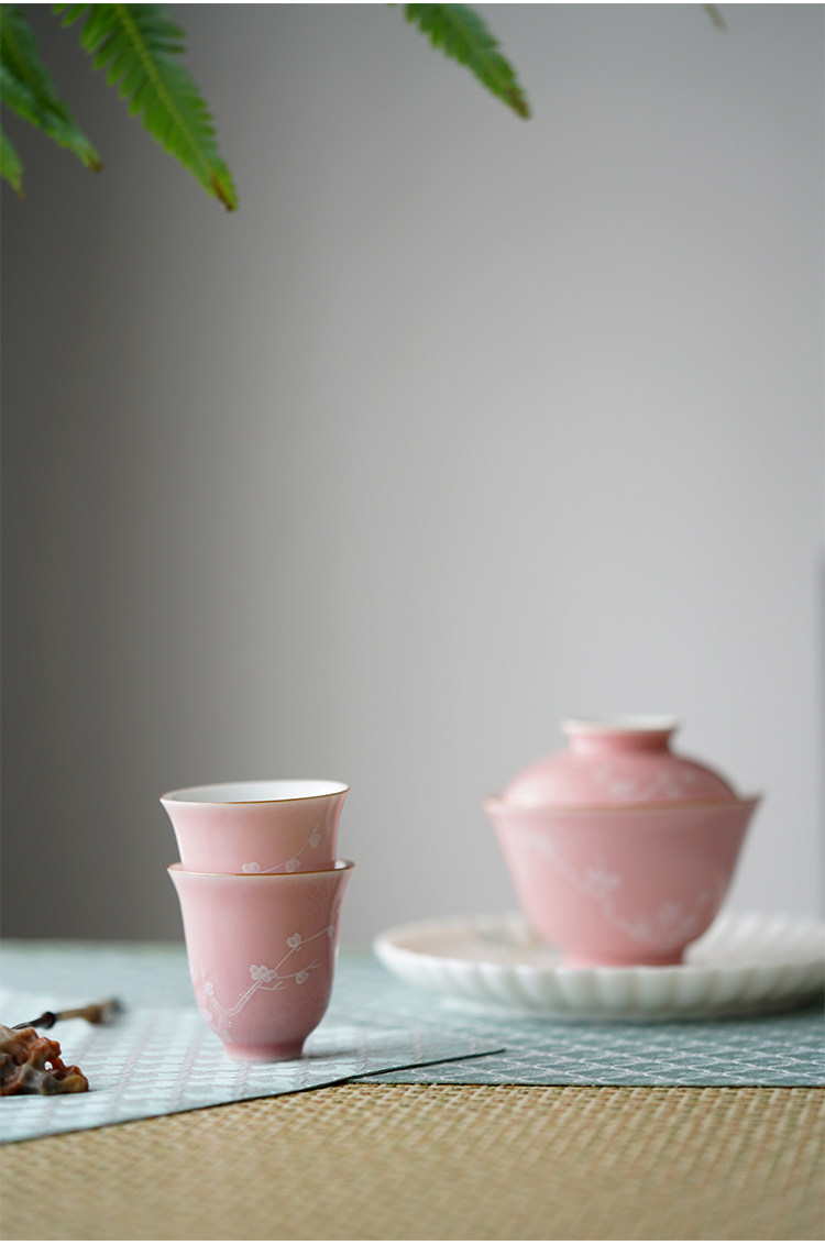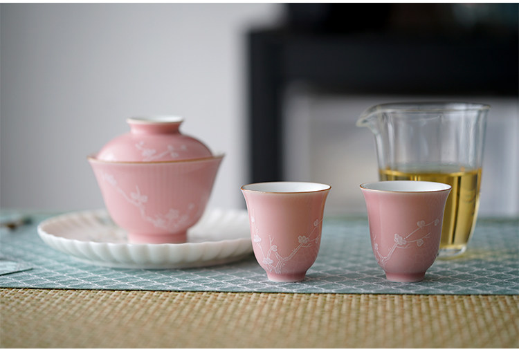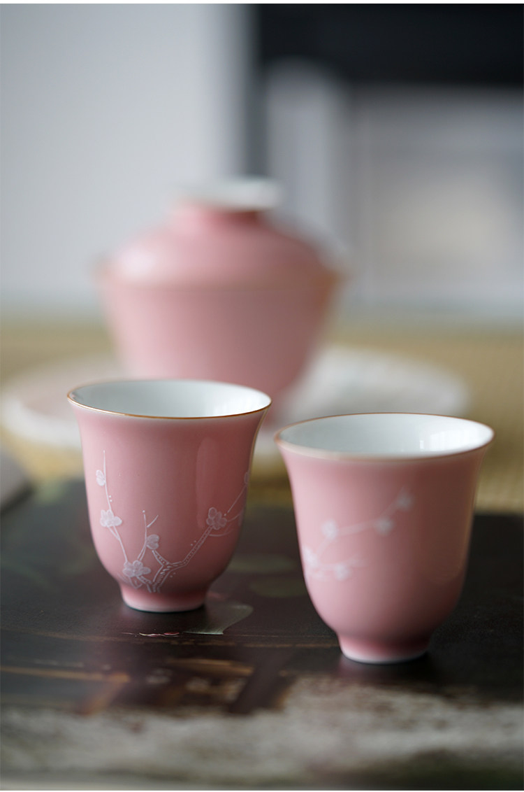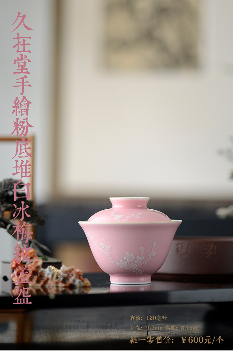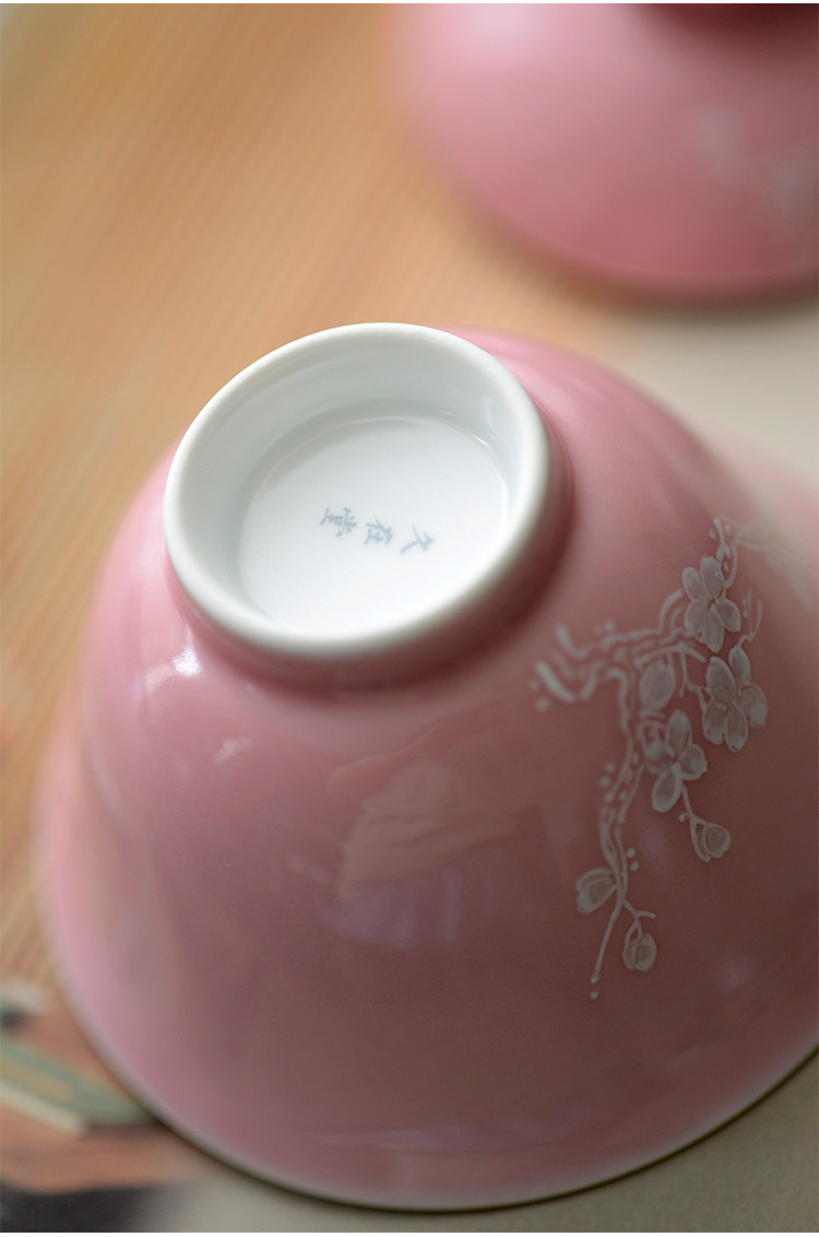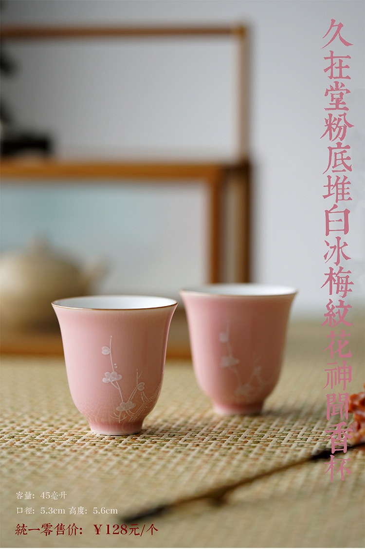 Говоря в течение долгого времени в розовой фундаментной куче белых цветов ледяной сливы, услышав ароматную чашку джингджэнь -керамической чайной чашки гуманистической чай