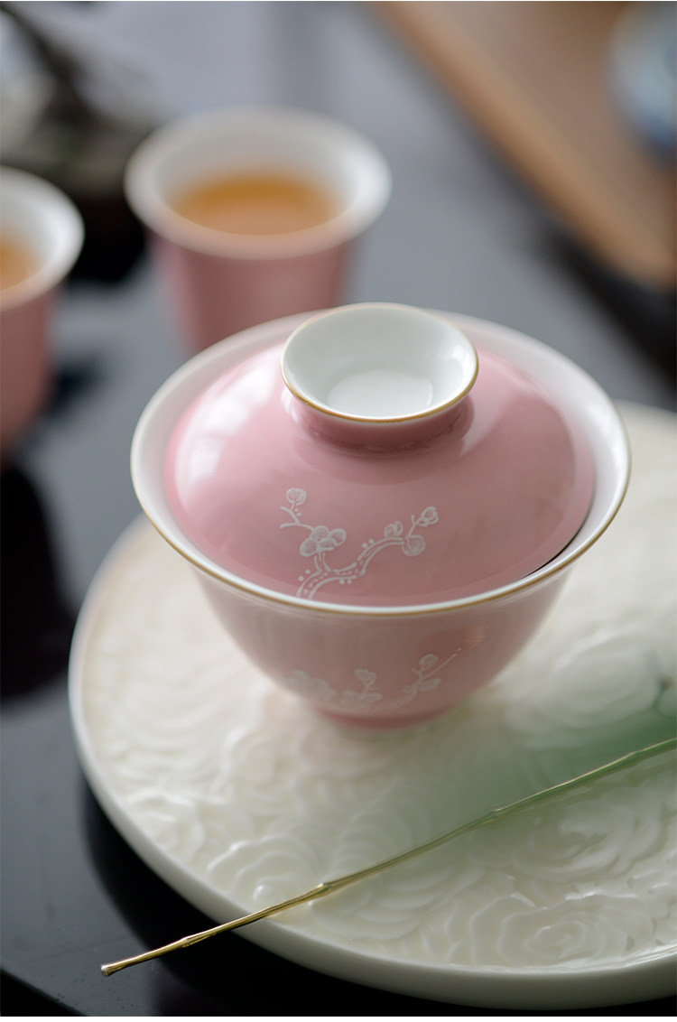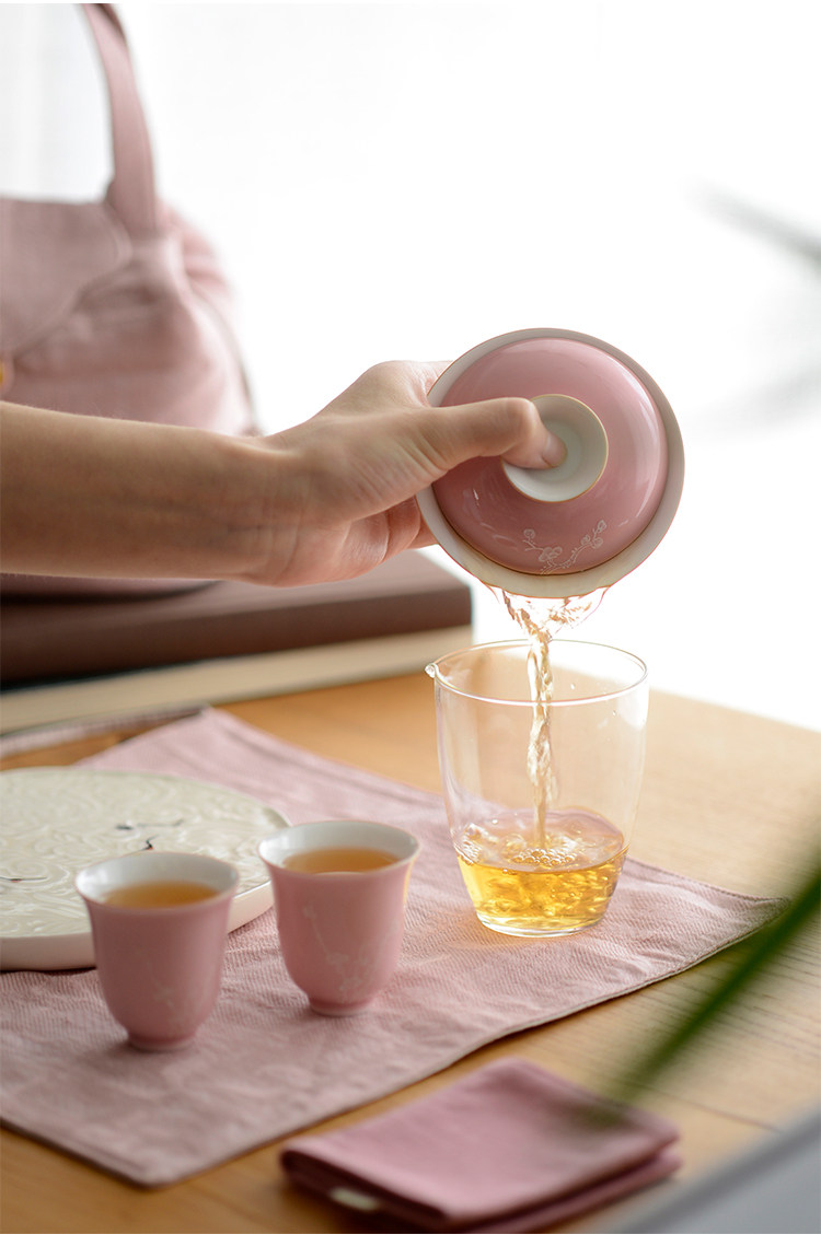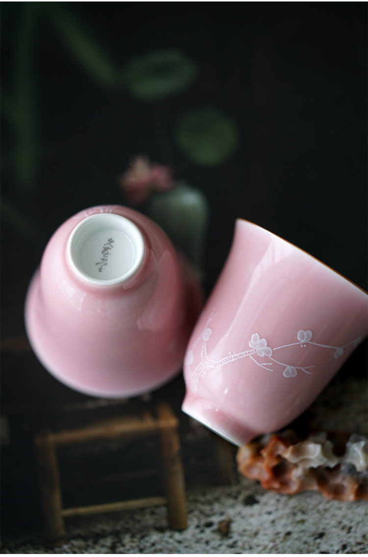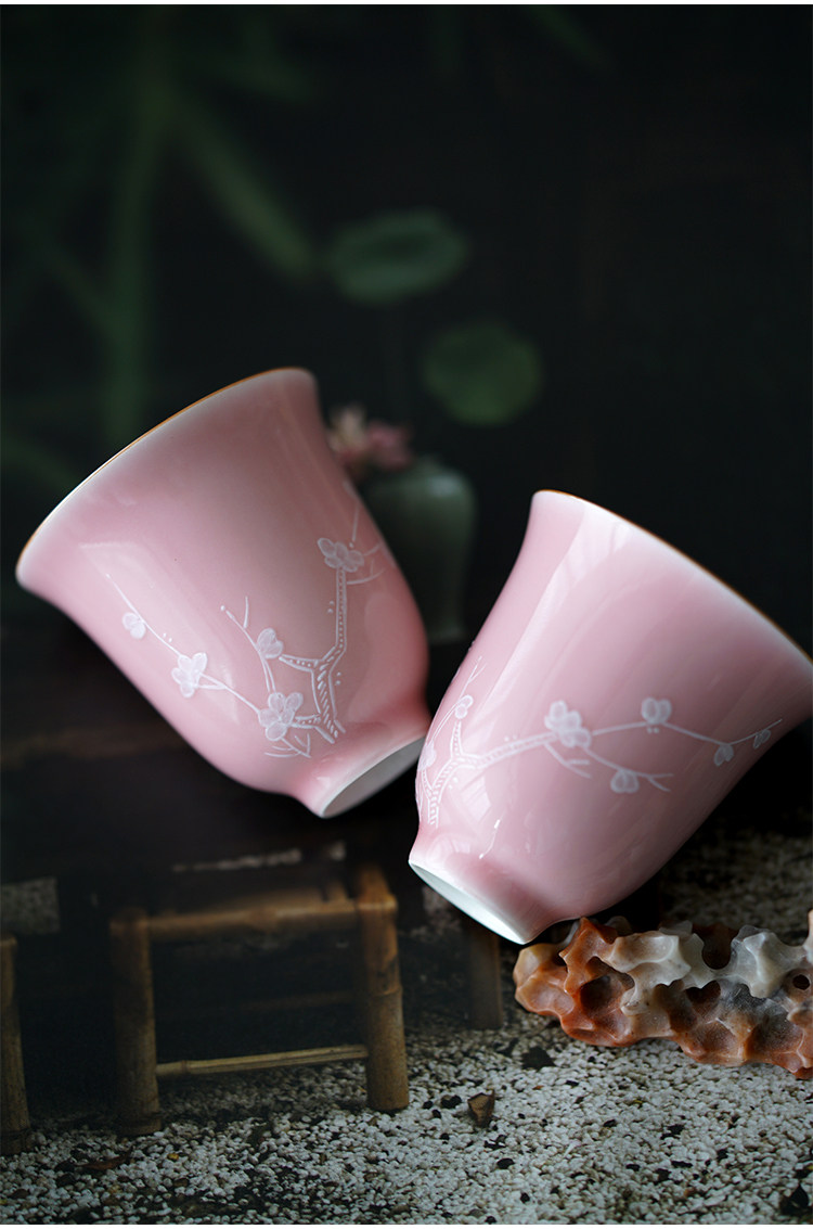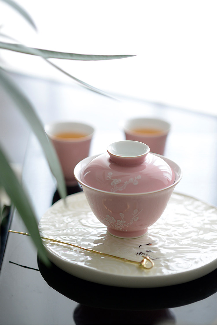 Говоря в течение долгого времени в розовой фундаментной куче белых цветов ледяной сливы, услышав ароматную чашку джингджэнь -керамической чайной чашки гуманистической чай