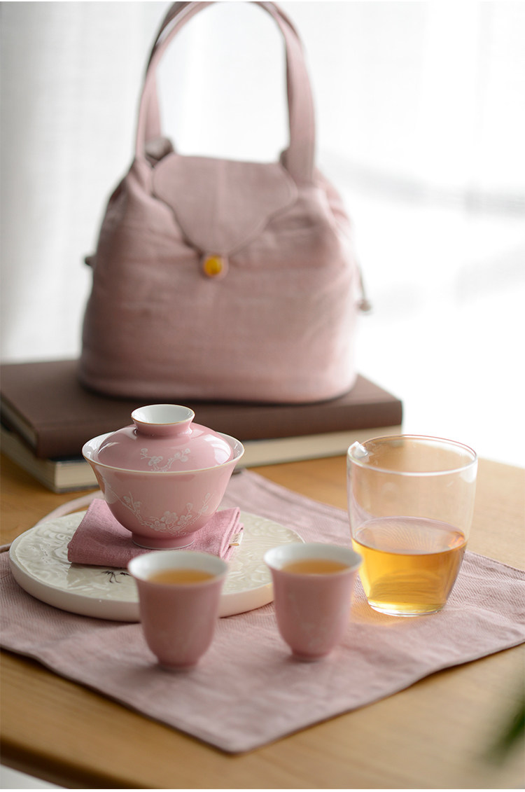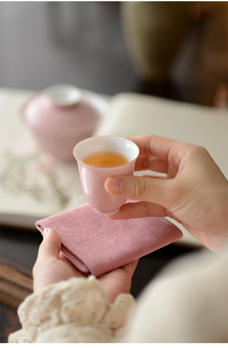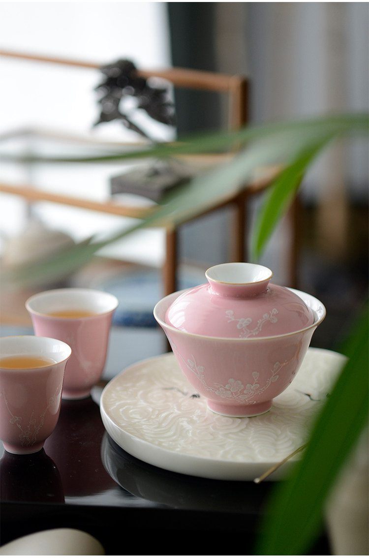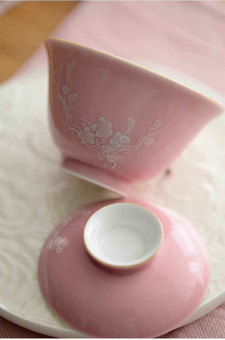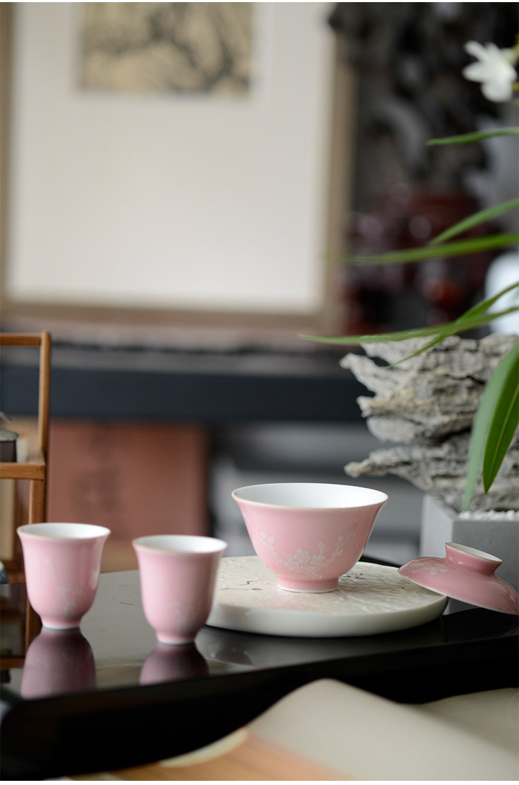 Говоря в течение долгого времени в розовой фундаментной куче белых цветов ледяной сливы, услышав ароматную чашку джингджэнь -керамической чайной чашки гуманистической чай