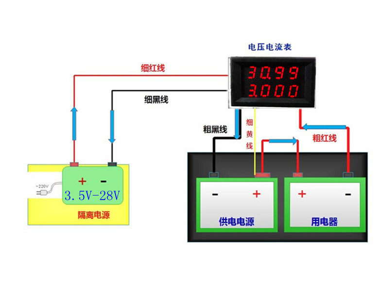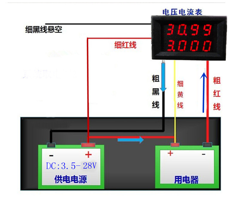 Тонкая черная линия (GND):питаться отисточник питанияВведите отрицательный электрод (3,5-28 В) вместе с сигналом измерения