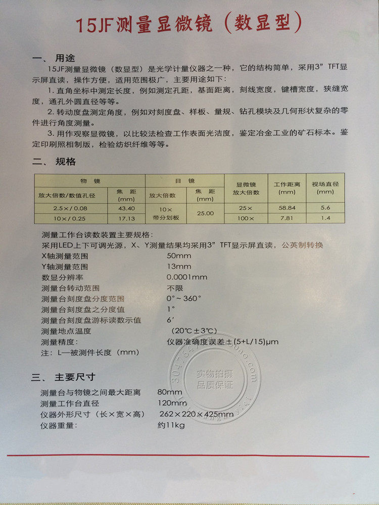 Измерительный микроскоп 15JF (с цифровым дисплеем) относится к числу оптических измерительных приборов. Он имеет простую структуру и принимает 3”Экран TFT-дисплея имеет прямое чтение, прост в эксплуатации и имеет широкий спектр применений. Основные виды использования заключаются в следующем: