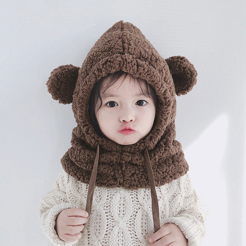 Детская шапка, демисезонный удерживающий тепло детский милый бархатный шарф с капюшоном для мальчиков, с медвежатами