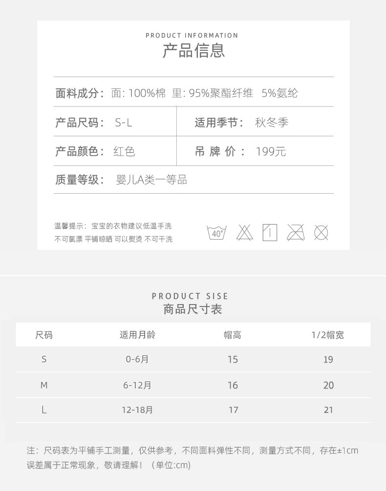 | Возрастная категория: | 0-6 мес., 38, 40, 6-12 мес., 40, L【12-18 месяцев】Окружность головы 43~45см |