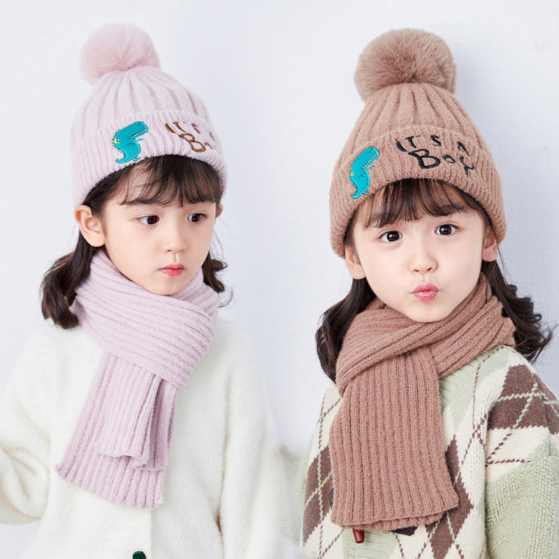 Зимняя удерживающая тепло трикотажная шерстяная шапка подходит для мужчин и женщин, шарф, комплект, флисовый динозавр, в корейском стиле