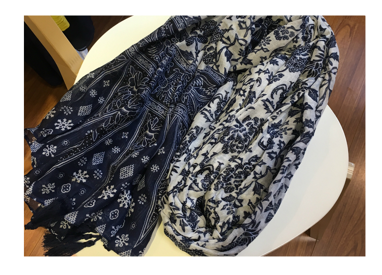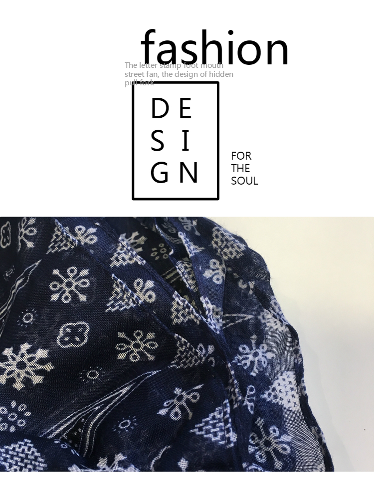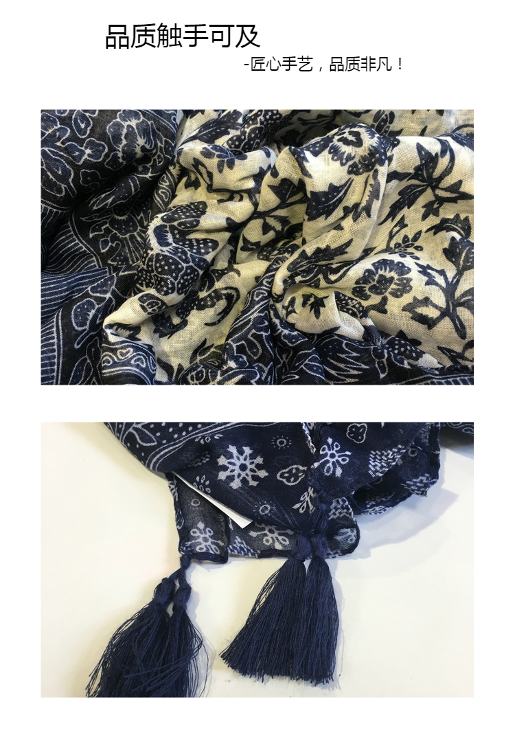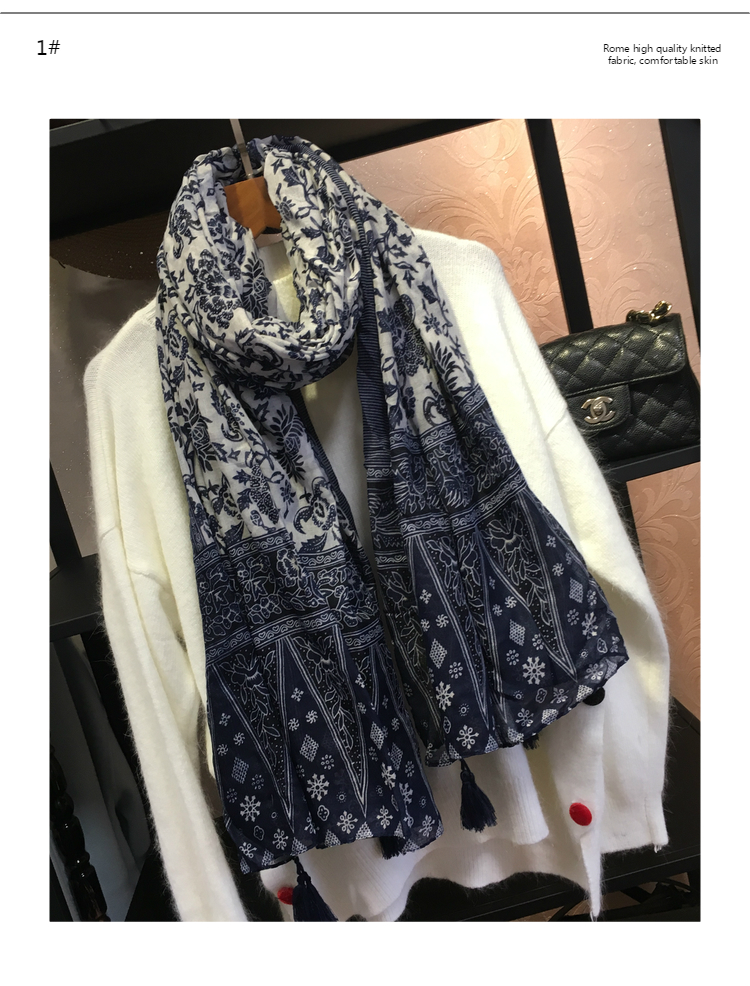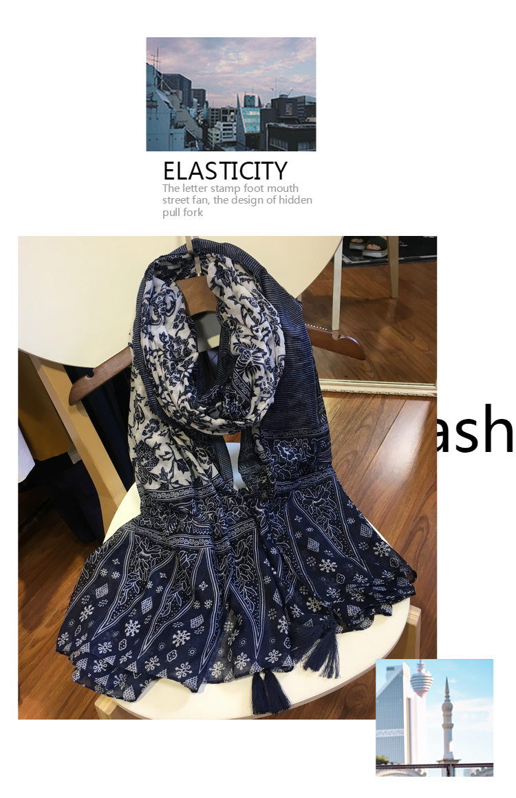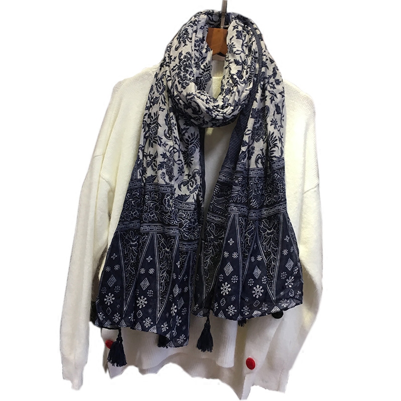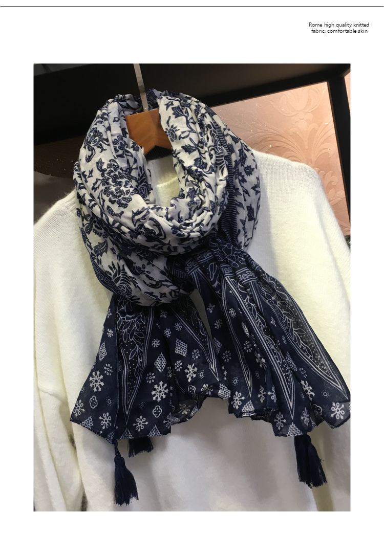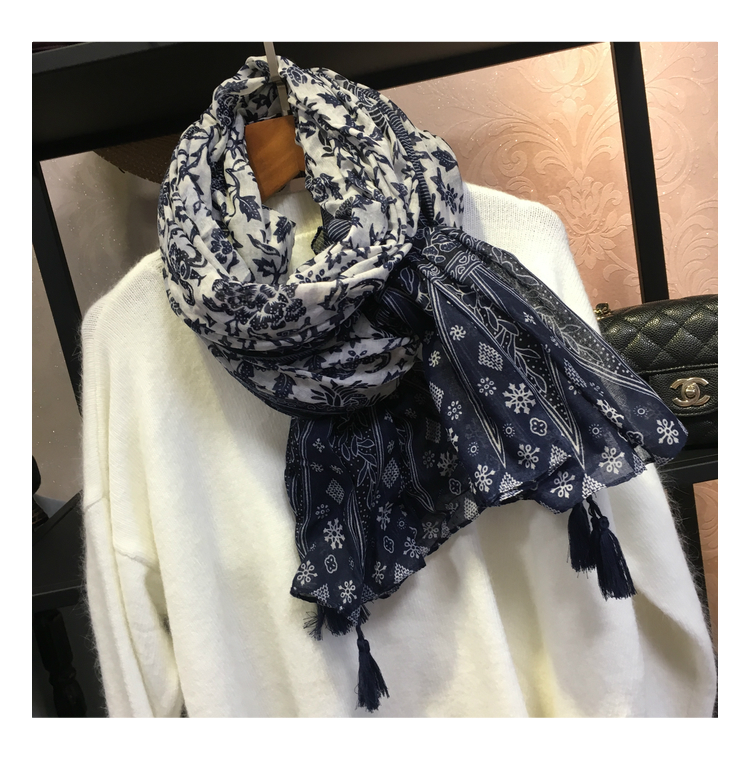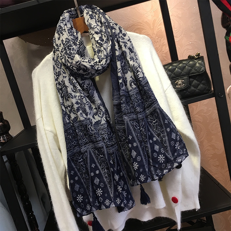 Ретро этнический сине-белый длинный осенний шарф, универсальная удерживающая тепло накидка, этнический стиль, из хлопка и льна