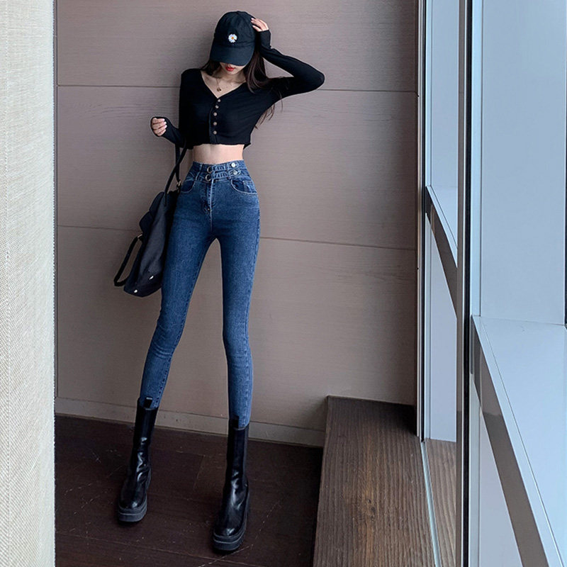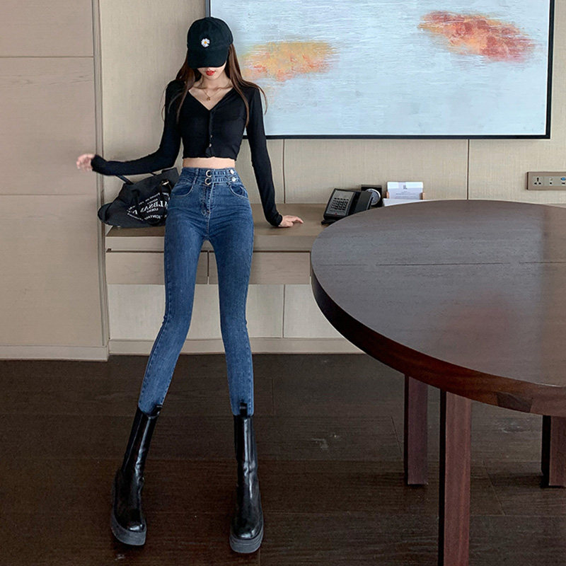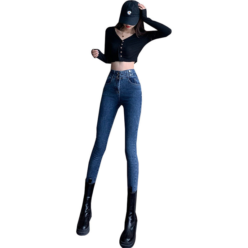 Синие джинсы, штаны, приталенный эластичный дизайнерский утягивающий пояс на талию, карандаш, 2021 года, новая коллекция, высокая талия, тренд сезона, в обтяжку