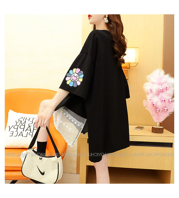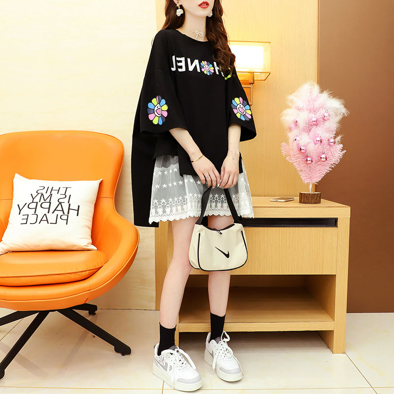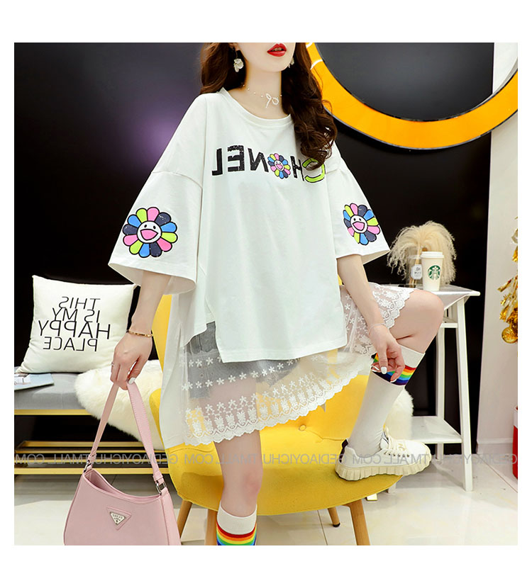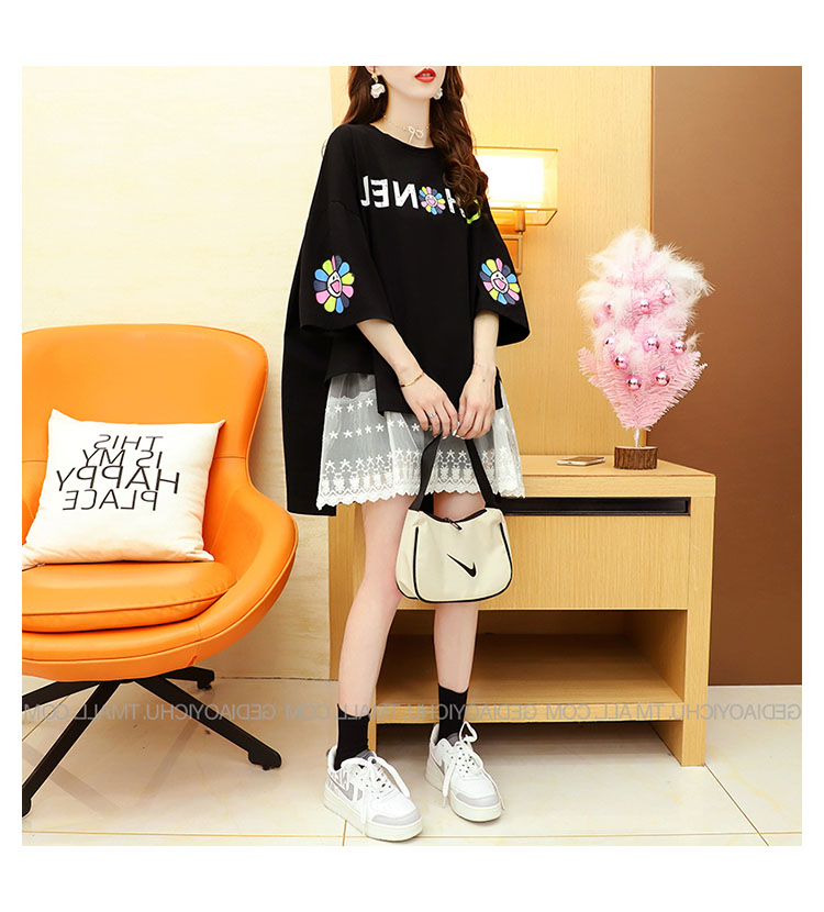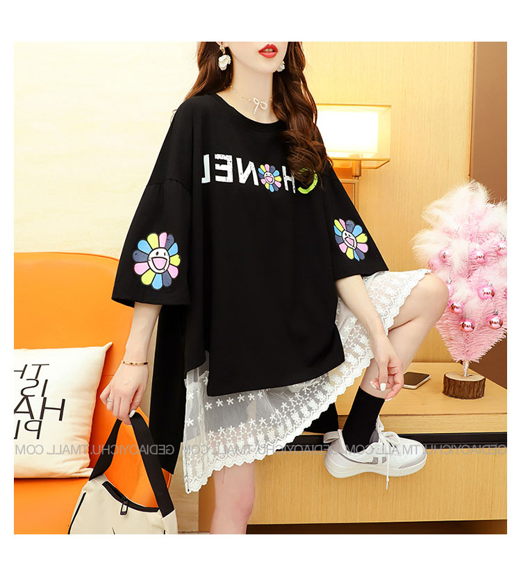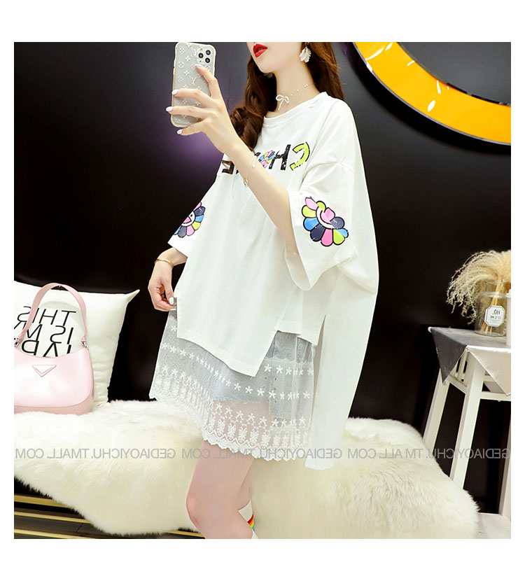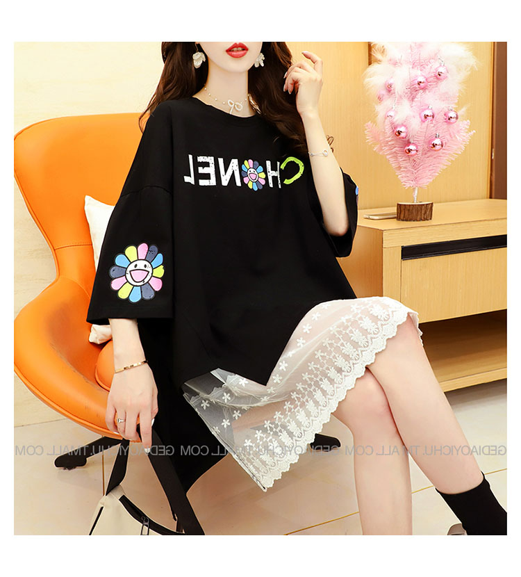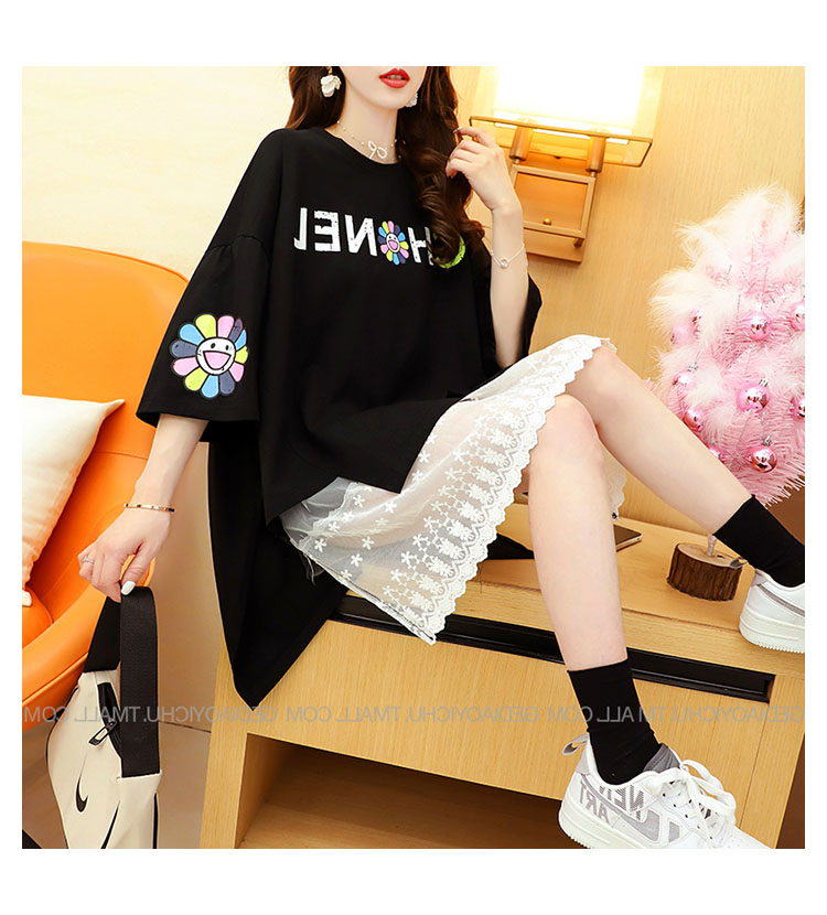 Кружевная длинная летняя дизайнерская футболка с коротким рукавом, средней длины, свободный крой, тренд сезона, большой размер