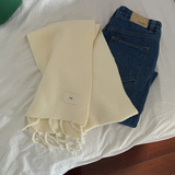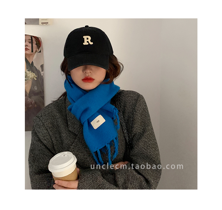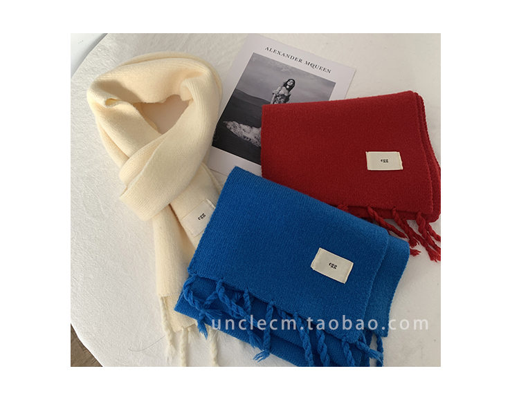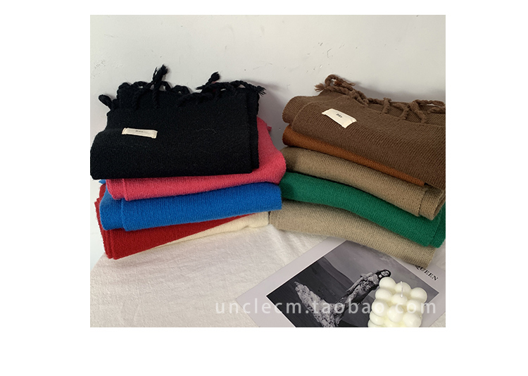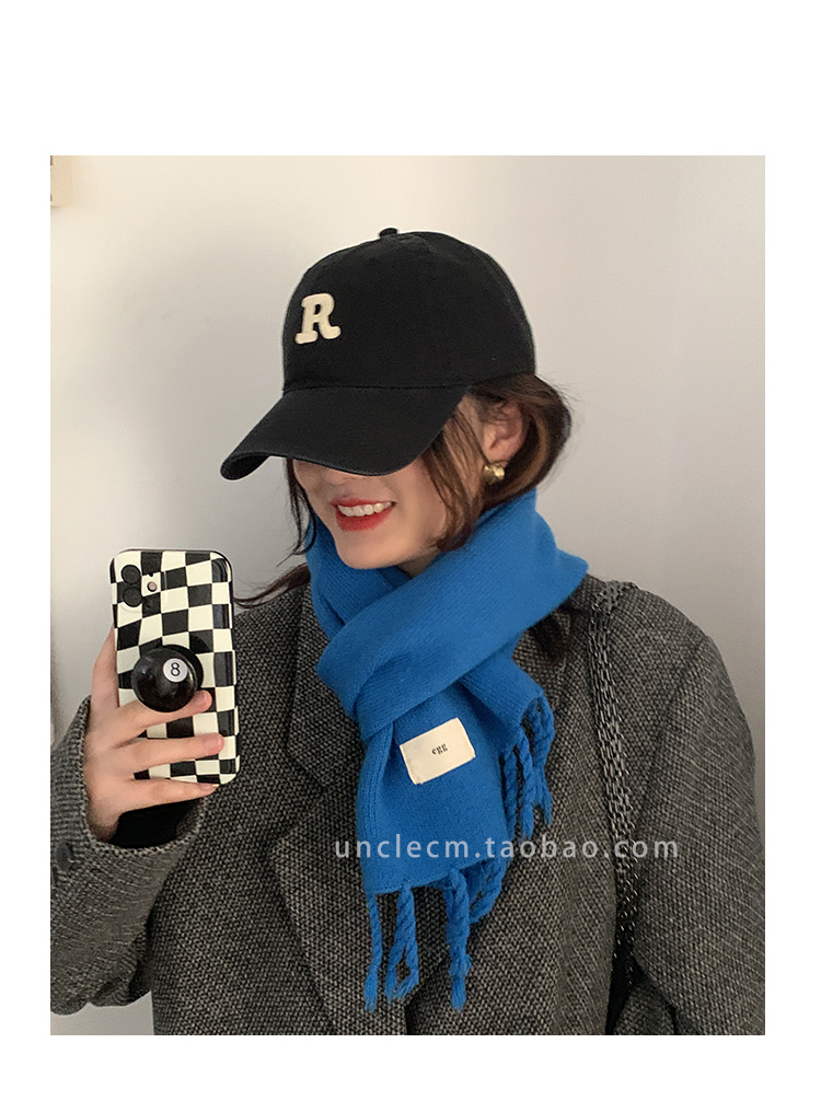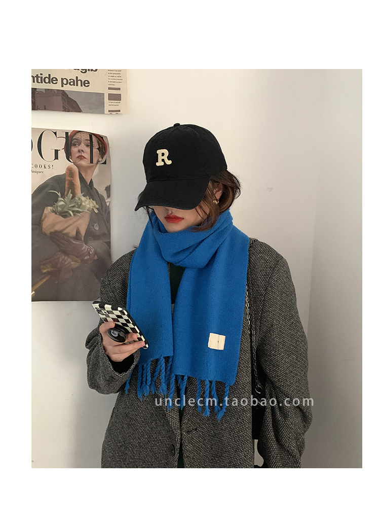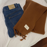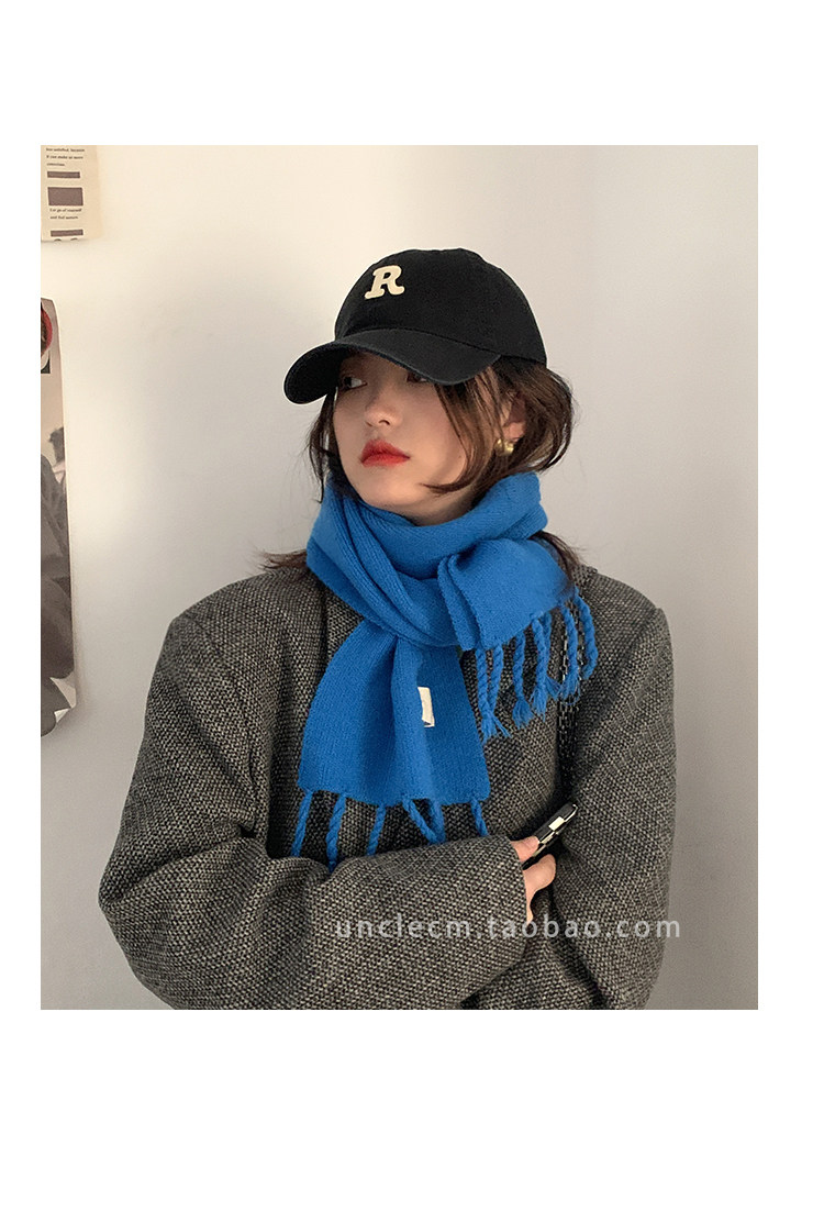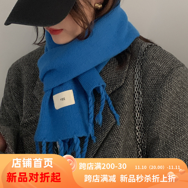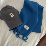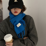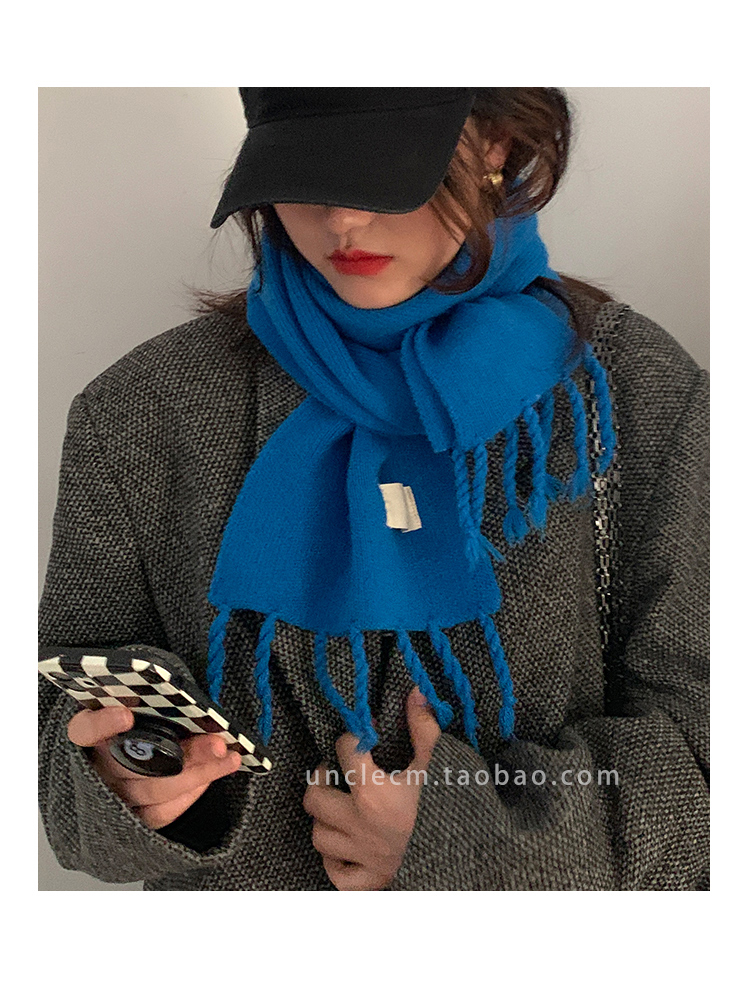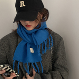 Трикотажный демисезонный утепленный универсальный синий шарф с кисточками, в корейском стиле