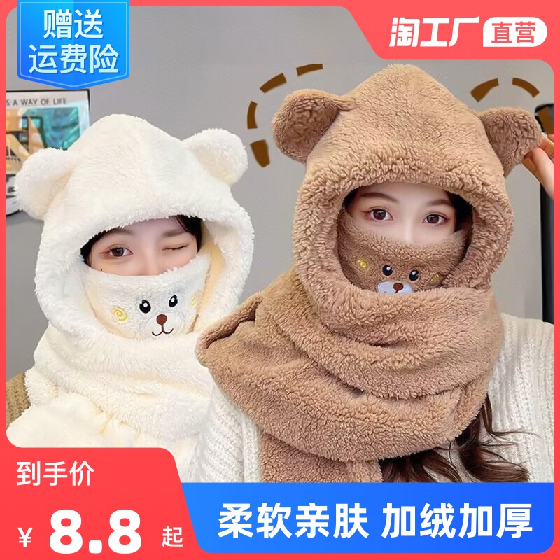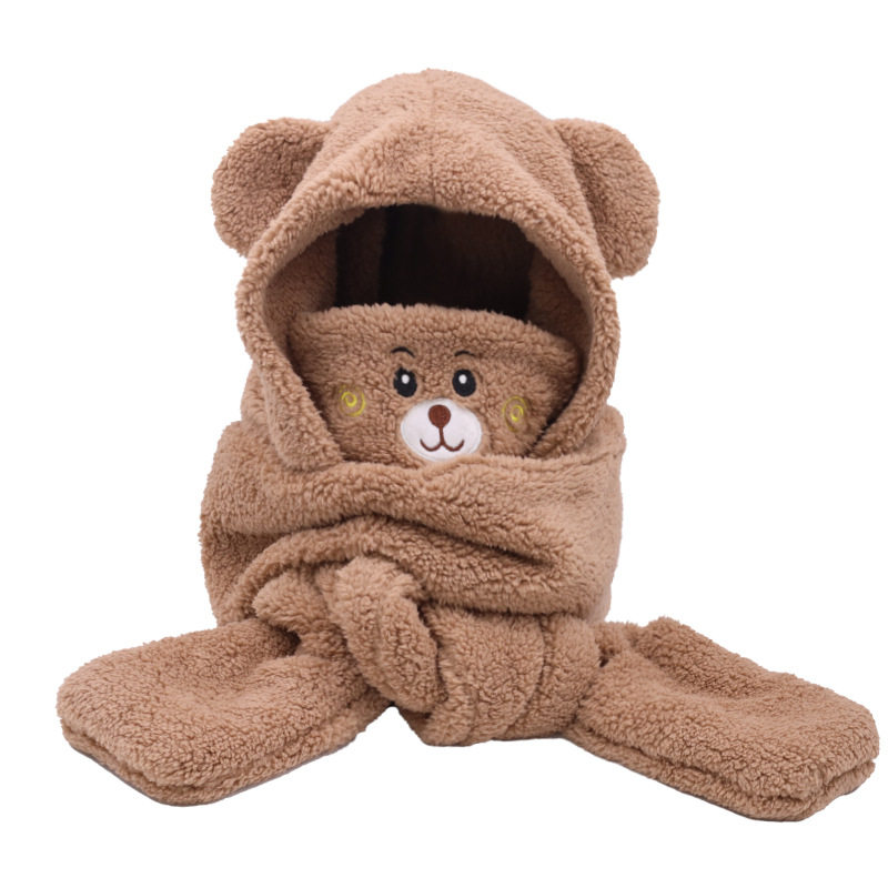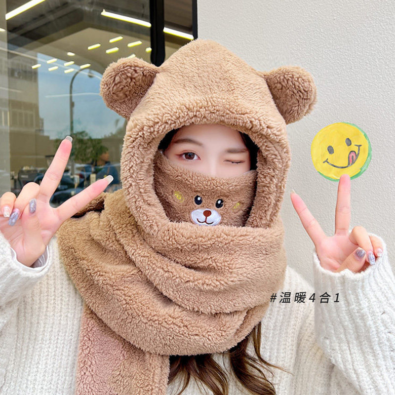Зимняя шапка, шарф, медицинская маска, удерживающие тепло перчатки с капюшоном, бархатный комплект, с медвежатами, 3 предмета