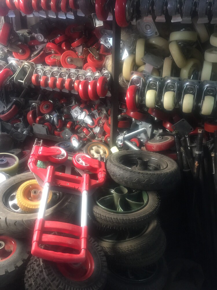 - Небольшая тележка с 5-дюймовыми красными бесшумными колесами.