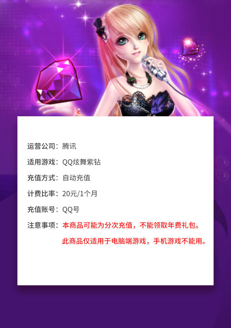 Tencent QQ Hyun Dance Purple Diamond 12 месяцев/QQ Hyun Dance Purple Diamond One Годовой мощность автоматическая перезарядка.