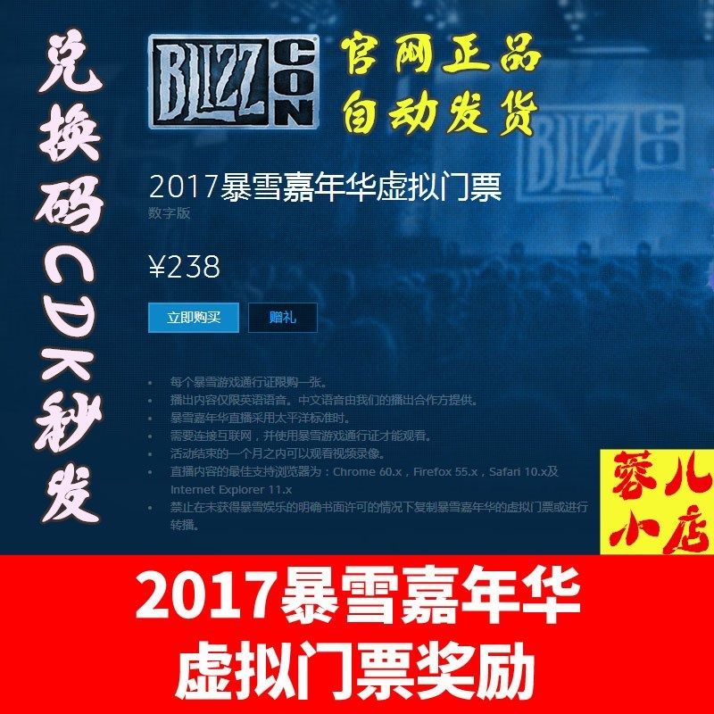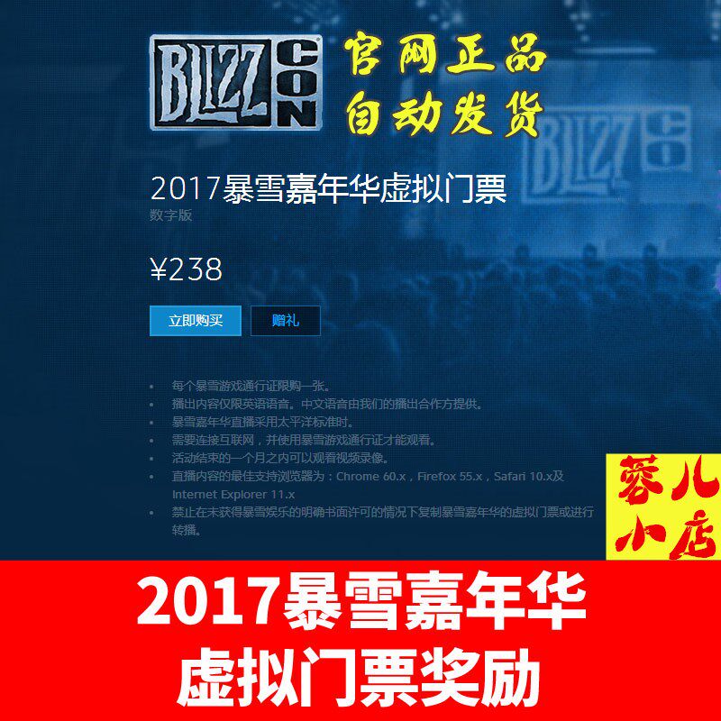 Этот продукт естьКод активации подарочного виртуального билета на BlizzCon 2017,Волявиртуальный билетКод активации отправляется непосредственно покупателю., покупатели могут войти в Battle.net и получить скидку напрямую!