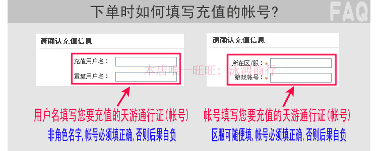 2. Пожалуйста, заполните свою игровой аккаунт (Tianyou Pass) точно при размещении заказа.Поскольку покупатель заполняет ошибку, сбой перезарядки или перезарядка в счет других, вызывает убытки и несет ответственность.