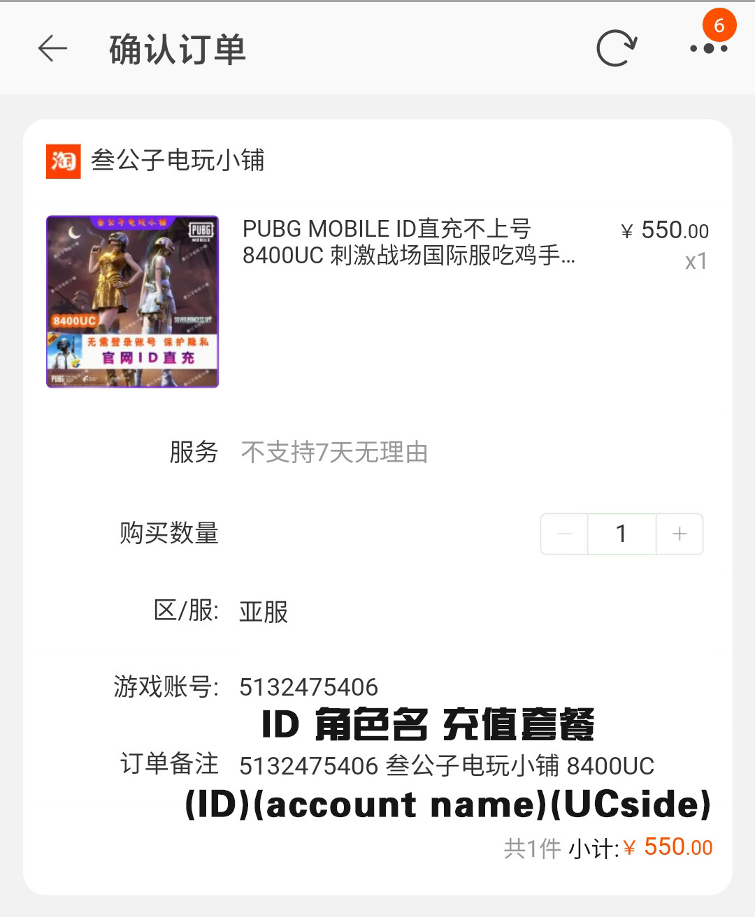 Заполните примечания к заказу: цифровой идентификатор + имя персонажа + пакет пополнения счета.