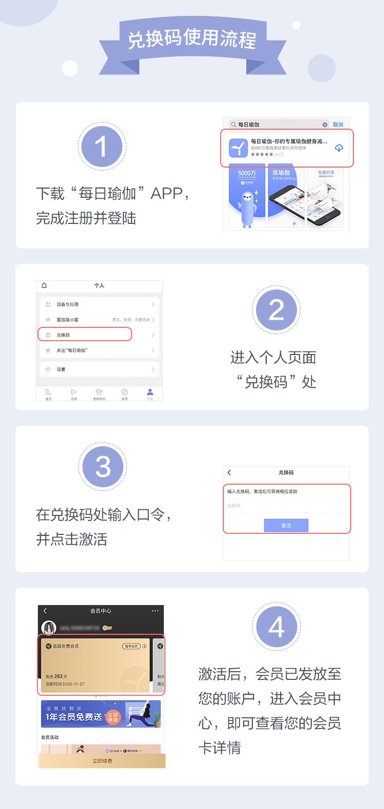 Метод обмена: скачать[Daily Yoga] приложение, регистрация учетной записи, нажмите【Личный центр】-[Код выкупа], скопируйте код приема выкупа, чтобы завершить обмен членством, пожалуйста, заполните выкуп в течение 7 дней, истечение не несет ответственности
