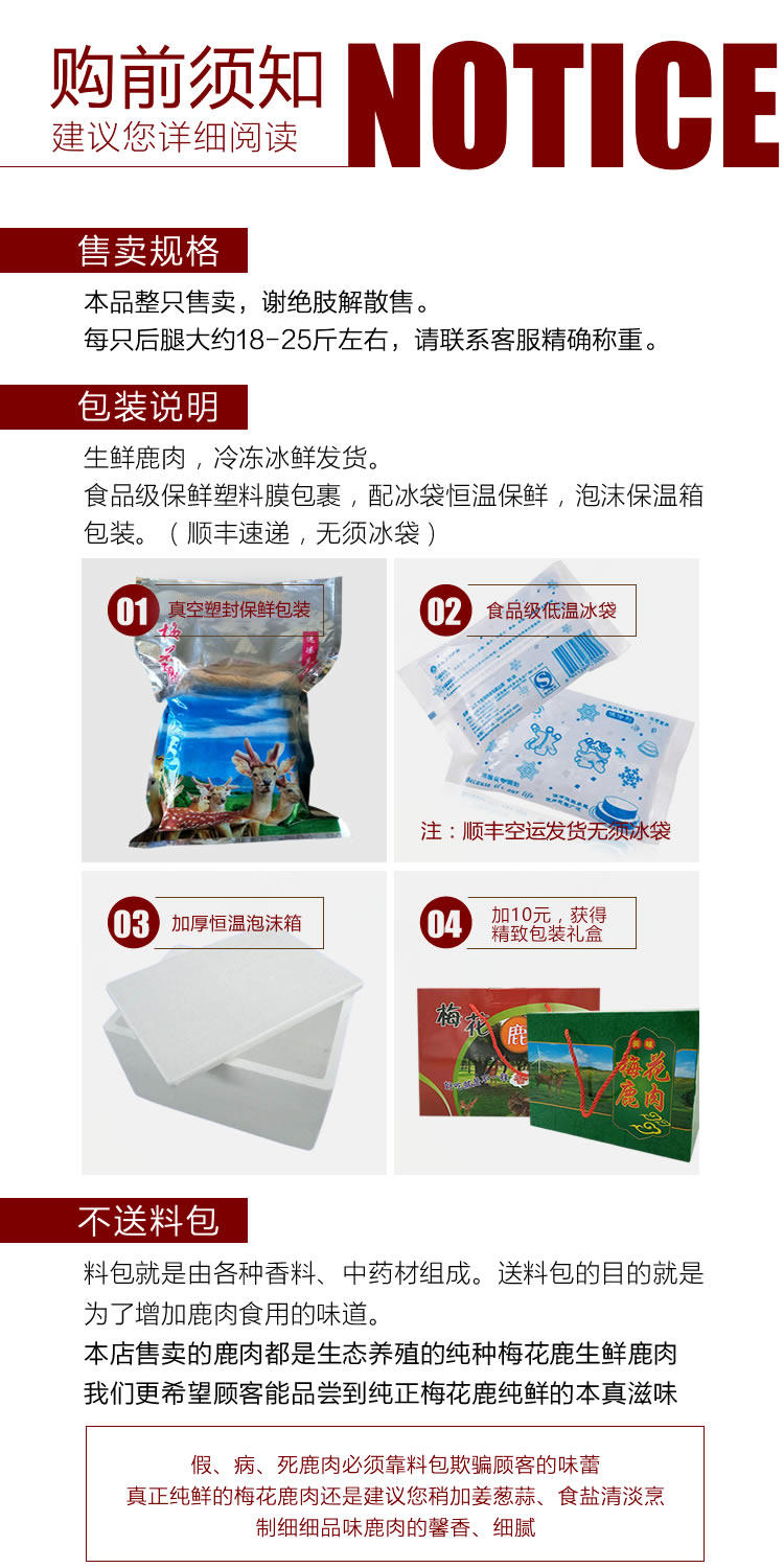 Джилин Сика оленя свежие оленя задних ног, вся распродажа&Lsquo; от 1 до 20 фунтов задних лапок. Для обычных экспресс -затрат на доставку, установленные этим продуктом, пожалуйста, компенсируйте SF Freight, если вам нужно отправить SF.Есть также кожаная оленина, ребра коры, позвоночник, кость ноги, печень оленя, олень  не рассматривайте наш магазин по этой причине.Другие клиенты взяли мясо и сказали, что не очень вкусно возвращать обслуживание клиентов, чтобы вернуть товары.Мой магазин продается с оленей и ядом Джилина Сика, и претензии нарушены, но это не вкусно  это связано с чувством населения, и это связано с тем, что я делаю. Невозможно удовлетворить вкус клиента.Так что не возвращайте продукт по разным причинам.Это наша ответственность. Мы должны управлять им, а не нашей ответственностью, не приходите к неприятностям, спасибо за сотрудничество.Никто не легко
