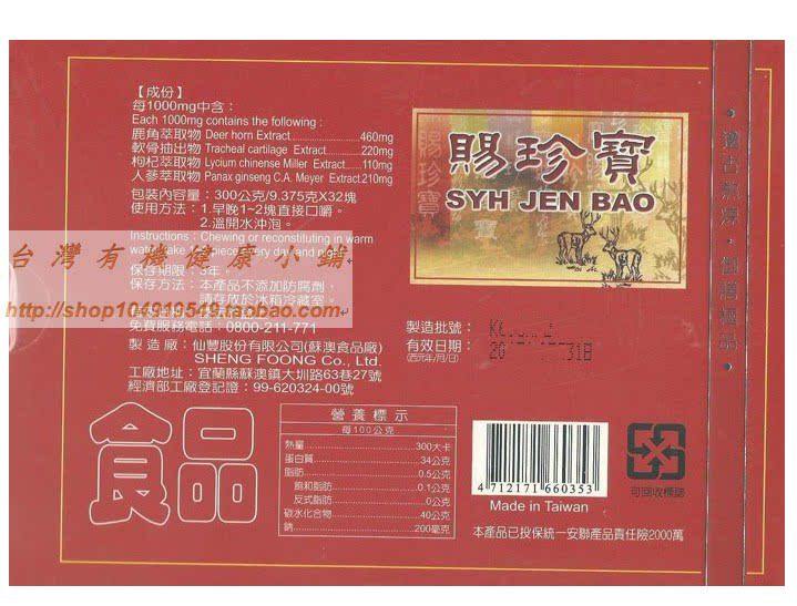 Произведено Тайванем Сянфенг Фармацевтической фабрики - Dingjiao пополнение продуктов питания.Фенг Чженбао. Два бессмертных геля оленей кипятят древними способами. 300 г, 32 маленьких кусочках