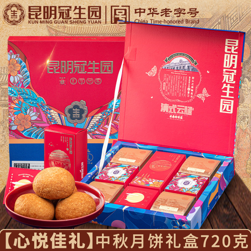 Kunming Guansheng Garden Mid -Autumn Festival Mooncake Gift Box 720G Цветок Постоянный лунный пирог Юньнань Облачные ноги Хэм Хэм Лунный пирог Подарки