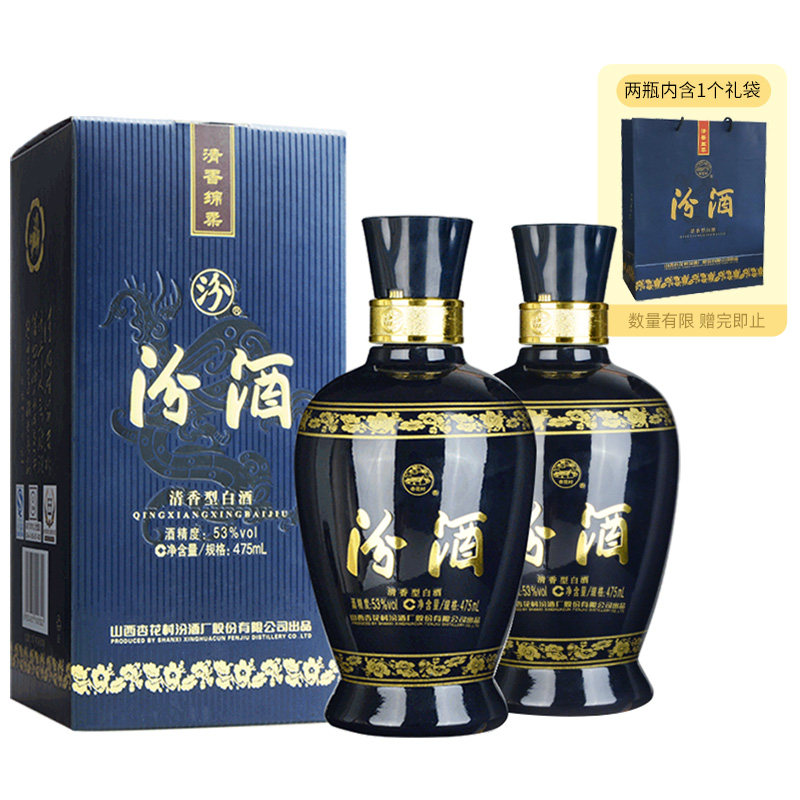 汾酒 Shanxi Singhua Village 53 градуса Lanfen 475 мл*2 бутылки с высоким содержанием белого вина и вина (подарочный пакет)