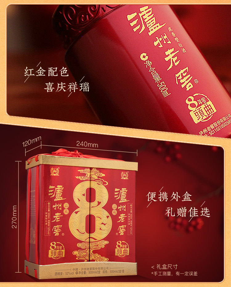 泸州老窖 52 градуса восемь -десяртных мелодий подвала, скрытый аромат типа Liquor 500 мл*2 Подарочная коробка для бутылки.
